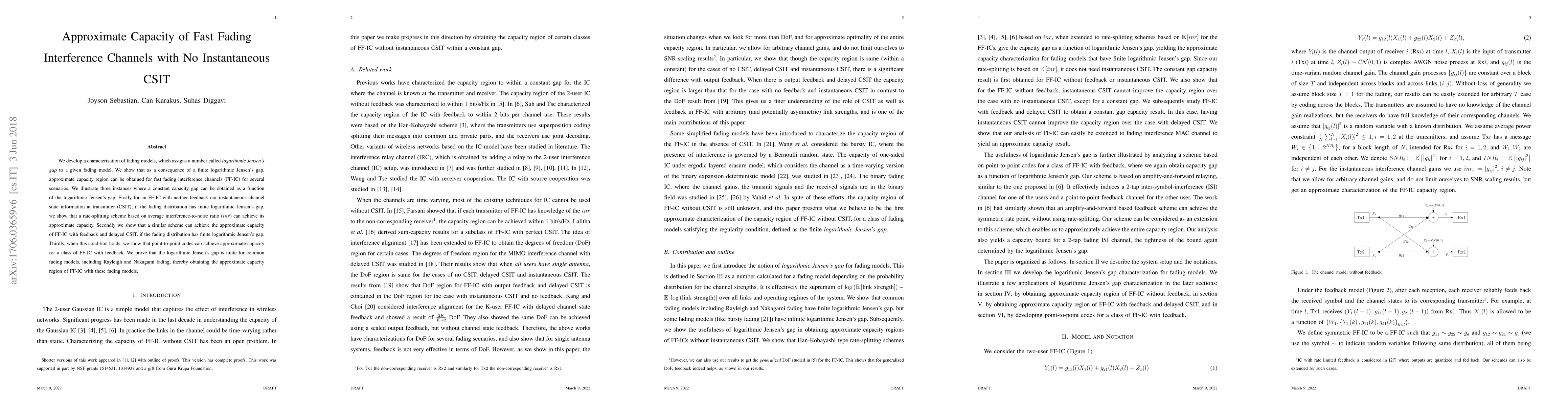 We develop a characterization of fading models, which assigns a number called logarithmic Jensen's gap to a given fading model. We show that as a consequence of a finite logarithmic Jensen's gap, approximate capacity region can be obtained for fast fading interference channels (FF-IC) for several scenarios. We illustrate three instances where a constant capacity gap can be obtained as a function of the logarithmic Jensen's gap. Firstly for an FF-IC with neither feedback nor instantaneous channel state information at transmitter (CSIT), if the fading distribution has finite logarithmic Jensen's gap, we show that a rate-splitting scheme based on average interference-to-noise ratio (inr) can achieve its approximate capacity. Secondly we show that a similar scheme can achieve the approximate capacity of FF-IC with feedback and delayed CSIT, if the fading distribution has finite logarithmic Jensen's gap. Thirdly, when this condition holds, we show that point-to-point codes can achieve approximate capacity for a class of FF-IC with feedback. We prove that the logarithmic Jensen's gap is finite for common fading models, including Rayleigh and Nakagami fading, thereby obtaining the approximate capacity region of FF-IC with these fading models. For Rayleigh fading the capacity gap is obtained as 1.83 bits per channel use for non-feedback case and 2.83 bits per channel use for feedback case. Our analysis also yields approximate capacity results for fading 2-tap ISI channel and fading interference multiple access channel as corollaries.