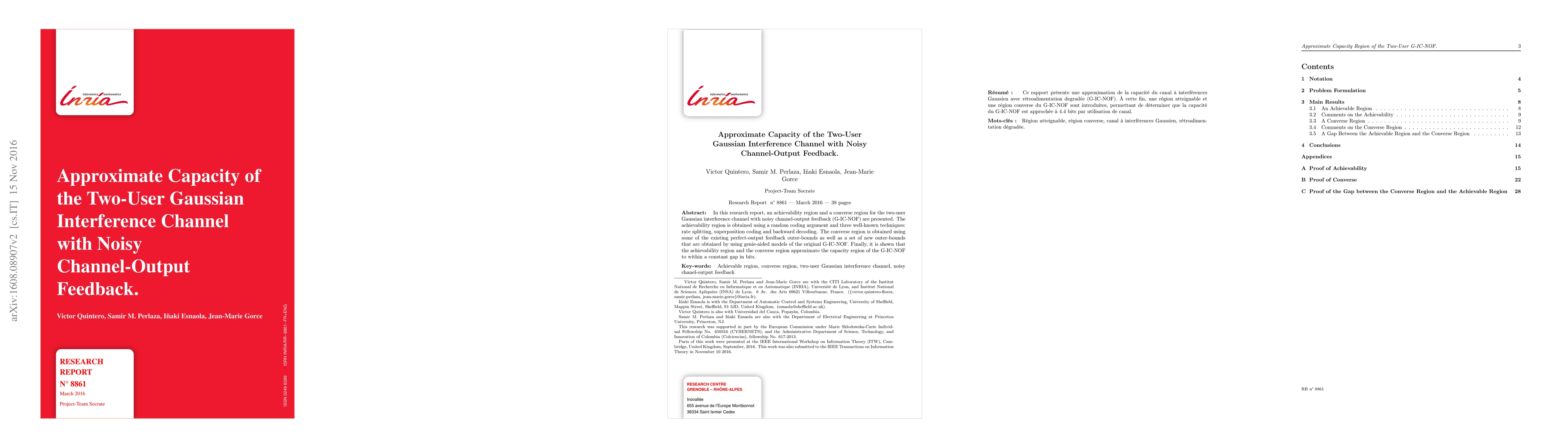In this research report, an achievability region and a converse region for the two-user Gaussian interference channel with noisy channel-output feedback (G-IC-NOF) are presented. The achievability region is obtained using a random coding argument and three well-known techniques: rate splitting, superposition coding and backward decoding. The converse region is obtained using some of the existing perfect-output feedback outer-bounds as well as a set of new outer-bounds that are obtained by using genie-aided models of the original G-IC-NOF. Finally, it is shown that the achievability region and the converse region approximate the capacity region of the G-IC-NOF to within a constant gap in bits per channel use.