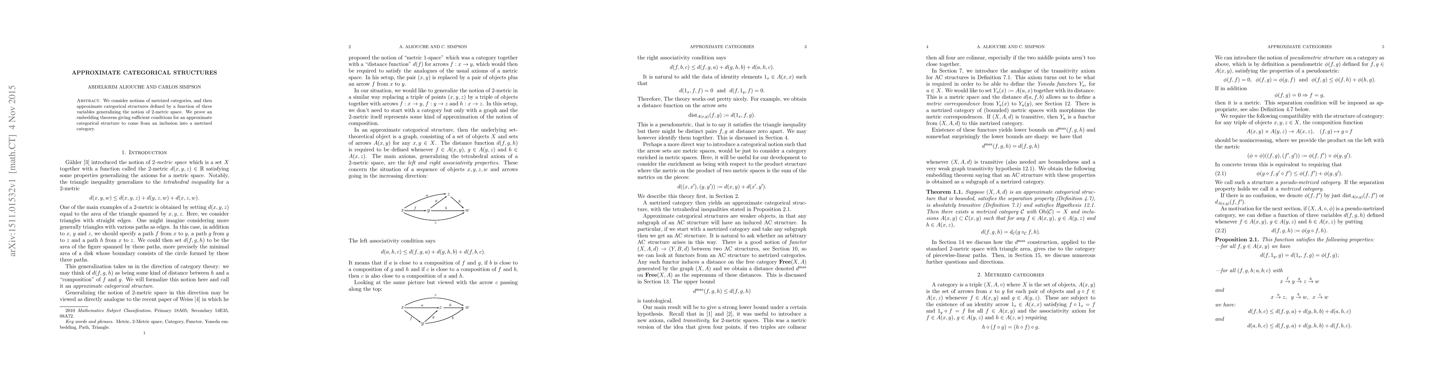 We consider notions of metrized categories, and then approximate categorical structures defined by a function of three variables generalizing the notion of $2$-metric space. We prove an embedding theorem giving sufficient conditions for an approximate categorical structure to come from an inclusion into a metrized category.