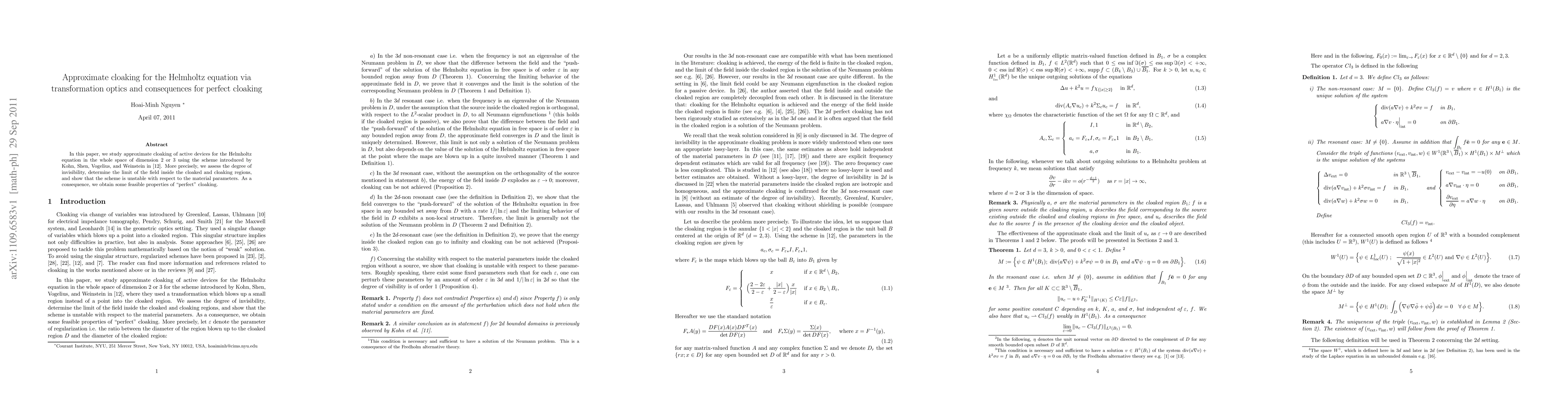This paper investigates approximate cloaking for the Helmholtz equation using transformation optics, assessing its invisibility degree and material parameter stability. It concludes that the scheme is unstable, thereby providing insights into the feasibility of "perfect" cloaking.