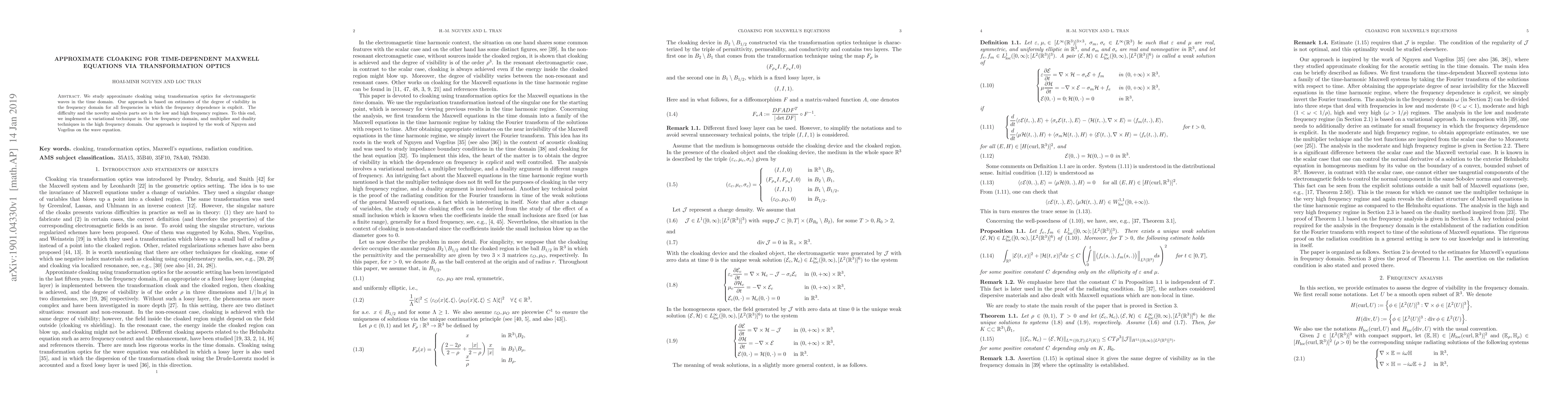 This paper investigates approximate cloaking of electromagnetic waves using transformation optics in the time domain, employing variational techniques for low frequencies and multiplier/duality methods for high frequencies. The approach focuses on the visibility degree in the frequency domain, addressing both low and high frequency regimes.