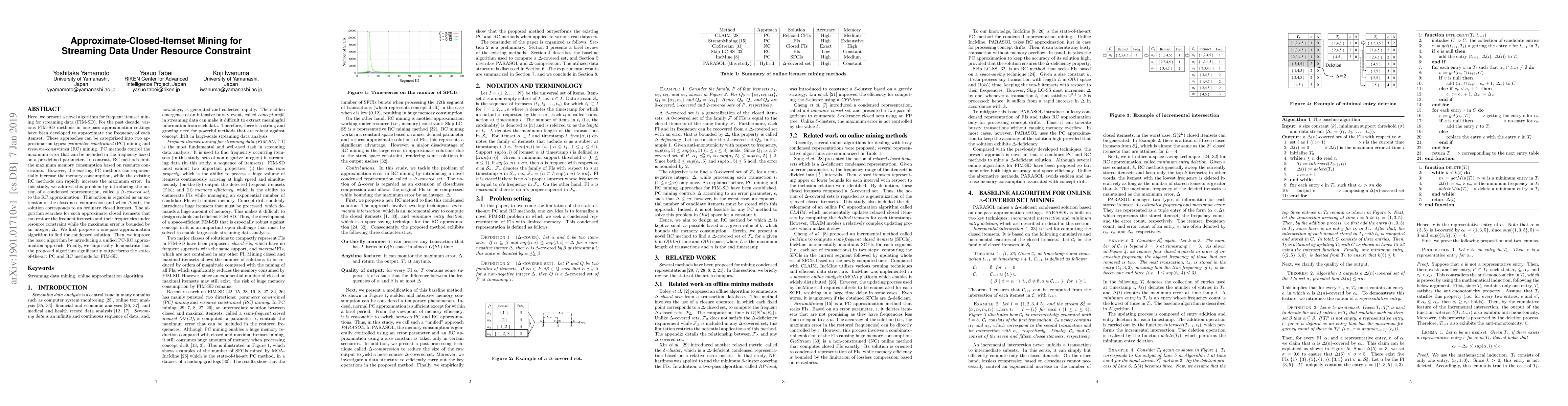 Here, we present a novel algorithm for frequent itemset mining for streaming data (FIM-SD). For the past decade, various FIM-SD methods in one-pass approximation settings have been developed to approximate the frequency of each itemset. These approaches can be categorized into two approximation types: parameter-constrained (PC) mining and resource-constrained (RC) mining. PC methods control the maximum error that can be included in the frequency based on a pre-defined parameter. In contrast, RC methods limit the maximum memory consumption based on resource constraints. However, the existing PC methods can exponentially increase the memory consumption, while the existing RC methods can rapidly increase the maximum error. In this study, we address this problem by introducing the notion of a condensed representation, called a $\Delta$-covered set, to the RC approximation. This notion is regarded as an extension of the closedness compression and when $\Delta = 0$, the solution corresponds to an ordinary closed itemset. The algorithm searches for such approximate closed itemsets that can restore the frequent itemsets and their frequencies under resource constraint while the maximum error is bounded by an integer, $\Delta$. We first propose a one-pass approximation algorithm to find the condensed solution. Then, we improve the basic algorithm by introducing a unified PC-RC approximation approach. Finally, we empirically demonstrate that the proposed algorithm significantly outperforms the state-of-the-art PC and RC methods for FIM-SD.