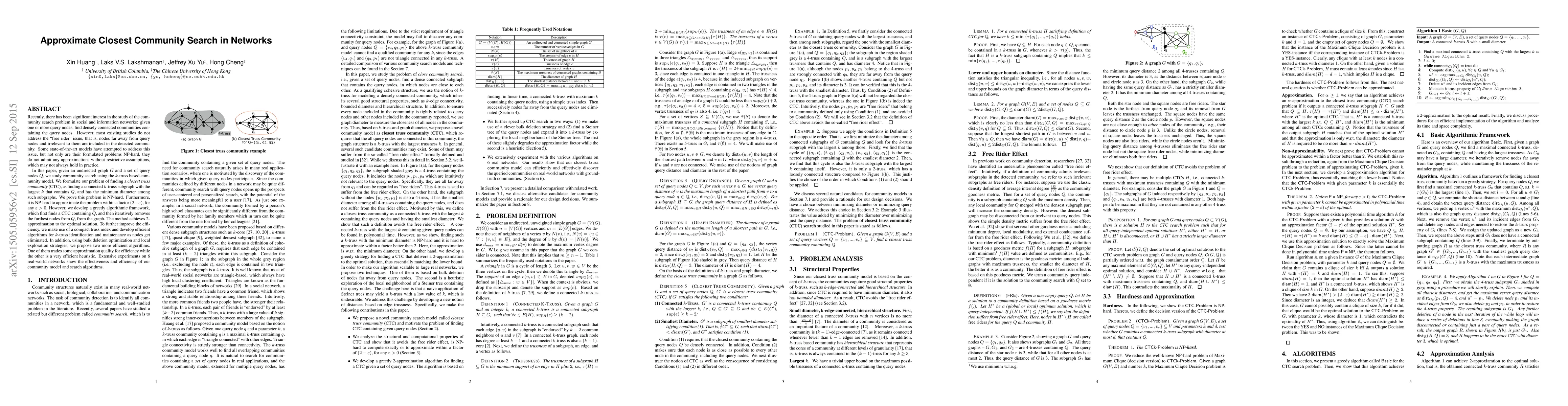 This paper addresses the community search problem in networks, focusing on finding densely connected communities containing query nodes while mitigating the "free rider" issue. It proposes a k-truss based model to find the closest truss community and develops a greedy algorithm achieving a 2-approximation, along with efficient algorithms for k-truss identification and maintenance. Experiments on real-world networks demonstrate the effectiveness and efficiency of the proposed methods.
