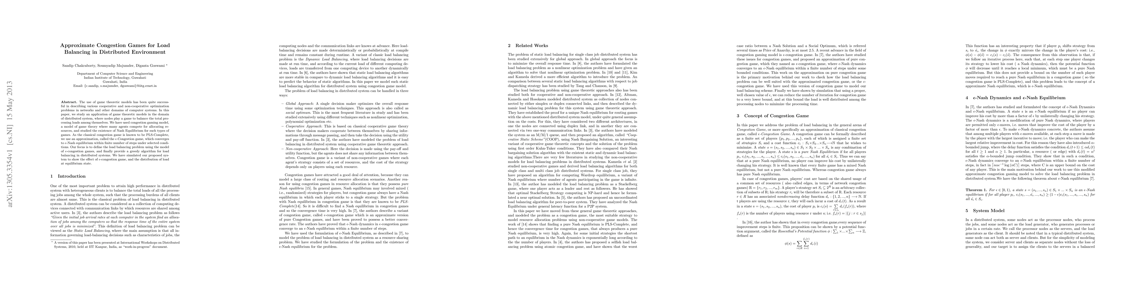 This paper explores the application of \epsilon-congestion games in distributed systems for load balancing, proposing a greedy algorithm to achieve \epsilon-Nash equilibrium. Simulation results demonstrate the effectiveness of the approach in balancing processing loads among nodes.