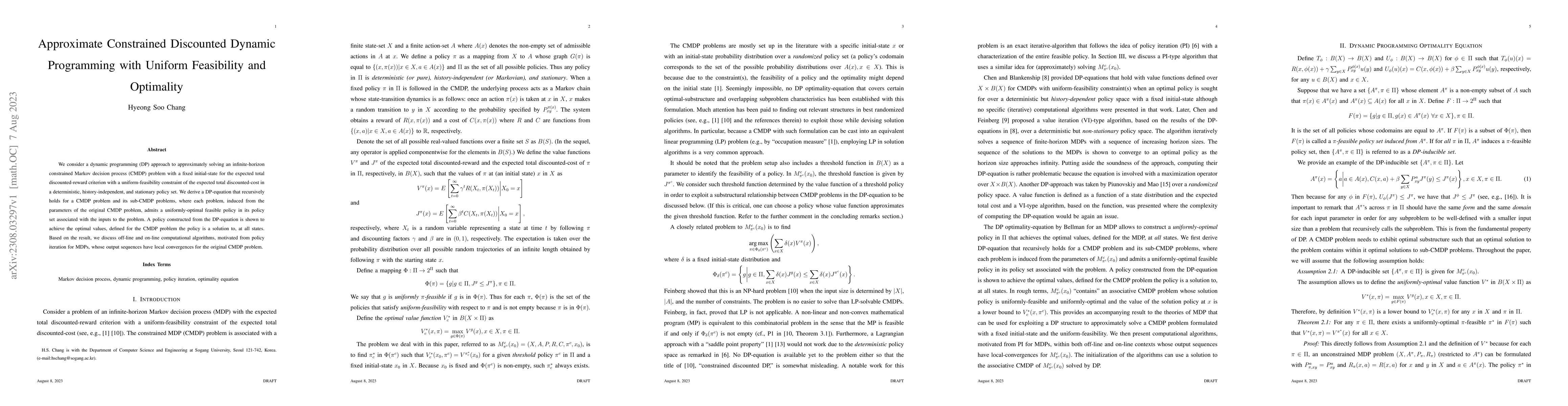 This paper proposes a dynamic programming approach to approximately solve constrained Markov decision processes with discounted rewards, ensuring uniform feasibility and optimality. It derives a recursive DP-equation and discusses computational algorithms with local convergence properties.