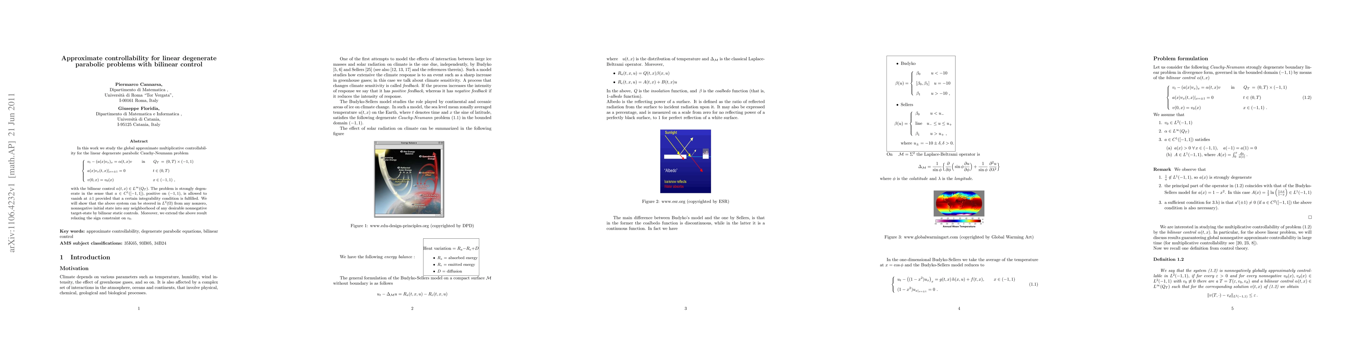 In this work we study the global approximate multiplicative controllability for the linear degenerate parabolic Cauchy-Neumann problem $$ \{{array}{l} \displaystyle{v_t-(a(x) v_x)_x =\alpha (t,x)v\,\,\qquad {in} \qquad Q_T \,=\,(0,T)\times(-1,1)} [2.5ex] \displaystyle{a(x)v_x(t,x)|_{x=\pm 1} = 0\,\,\qquad\qquad\qquad\,\, t\in (0,T)} [2.5ex] \displaystyle{v(0,x)=v_0 (x) \,\qquad\qquad\qquad\qquad\quad\,\, x\in (-1,1)}, {array}. $$ with the bilinear control $\alpha(t,x)\in L^\infty (Q_T).$ The problem is strongly degenerate in the sense that $a\in C^1([-1,1]),$ positive on $(-1,1),$ is allowed to vanish at $\pm 1$ provided that a certain integrability condition is fulfilled. We will show that the above system can be steered in $L^2(\Omega)$ from any nonzero, nonnegative initial state into any neighborhood of any desirable nonnegative target-state by bilinear static controls. Moreover, we extend the above result relaxing the sign constraint on $v_0$.