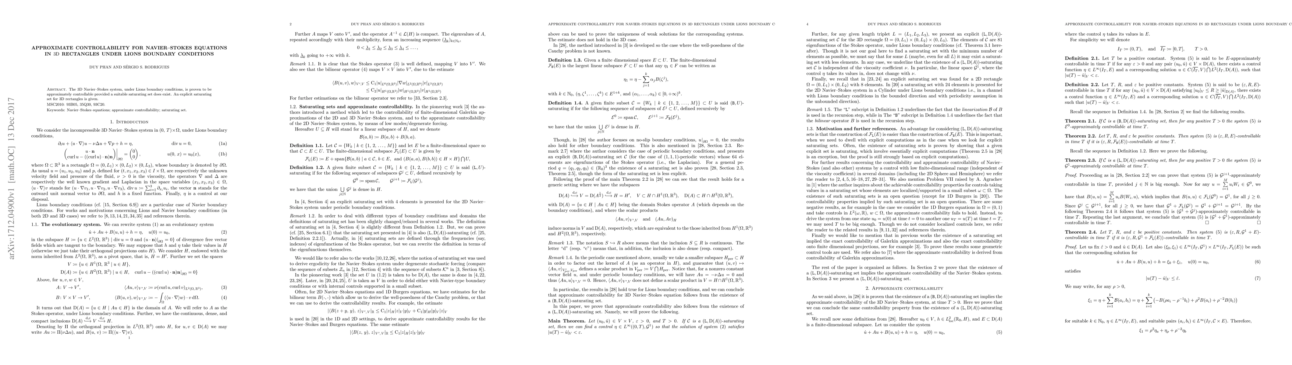 The $\mathrm{3D}$ Navier--Stokes system, under Lions boundary conditions, is proven to be approximately controllable provided a suitable saturating set does exist. An explicit saturating set for $\mathrm{3D}$ rectangles is given.