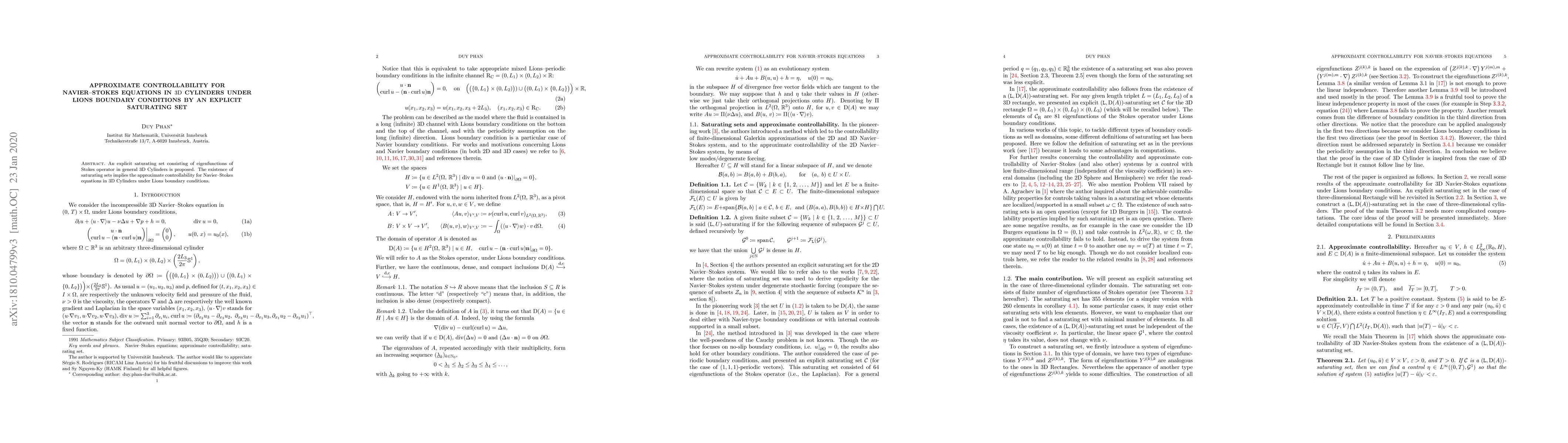A study proposes an explicit saturating set for Navier-Stokes equations in 3D cylinders, enabling approximate controllability under Lions boundary conditions. This finding has implications for the control of fluid flows in cylindrical geometries.