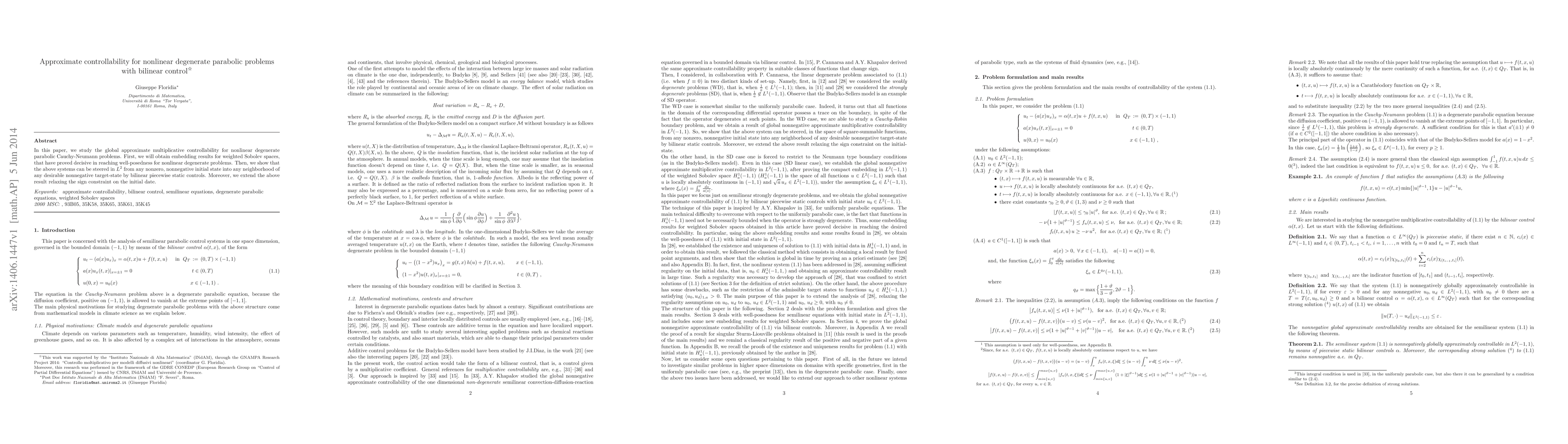 This paper investigates global approximate controllability for nonlinear degenerate parabolic problems with bilinear control, establishing embedding results for weighted Sobolev spaces to ensure well-posedness. It demonstrates that such systems can be steered in $L^2$ to any desired nonnegative target state using bilinear piecewise static controls.