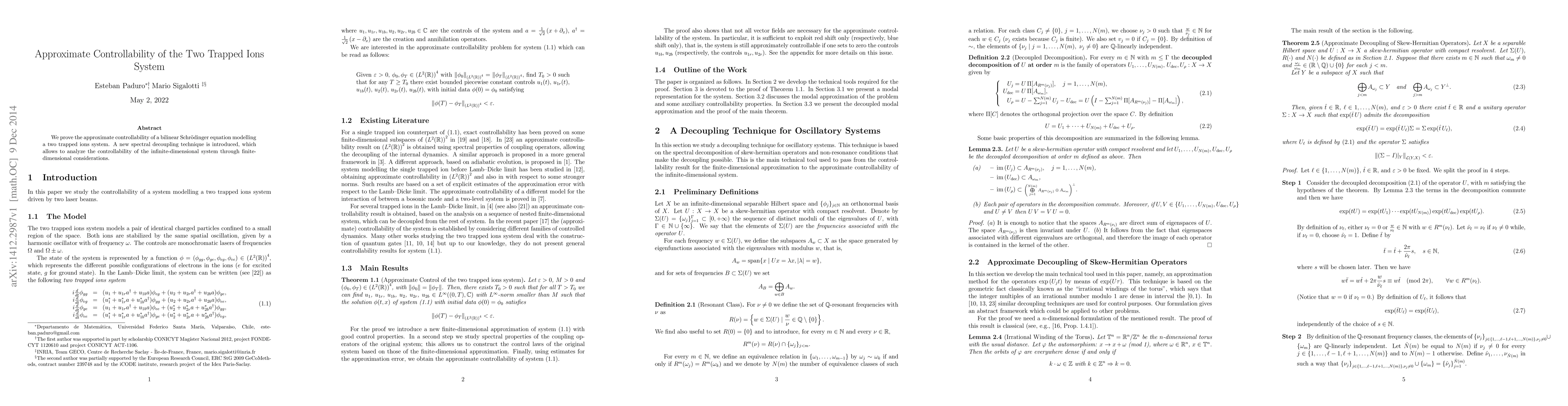 We prove the approximate controllability of a bilinear Schr\"odinger equation modelling a two trapped ions system. A new spectral decoupling technique is introduced, which allows to analyze the controllability of the infinite-dimensional system through finite-dimensional considerations.