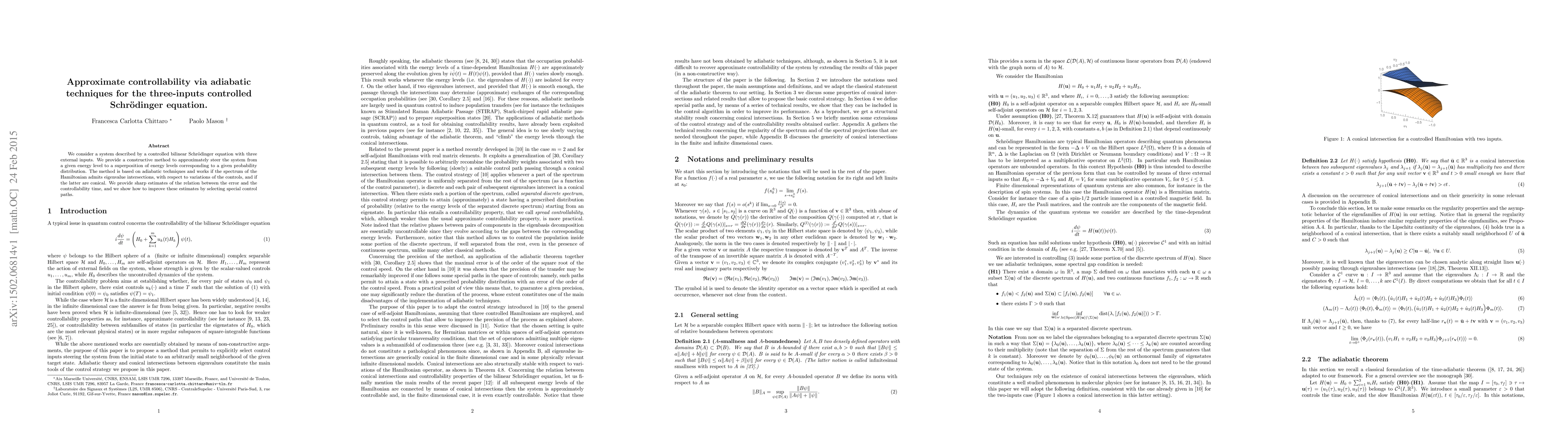 This paper presents a method for approximately controlling a three-input controlled bilinear Schrödinger equation using adiabatic techniques. It achieves steering from a specific energy level to a desired superposition, even when Hamiltonian eigenvalues intersect, and provides estimates for error versus control time.
