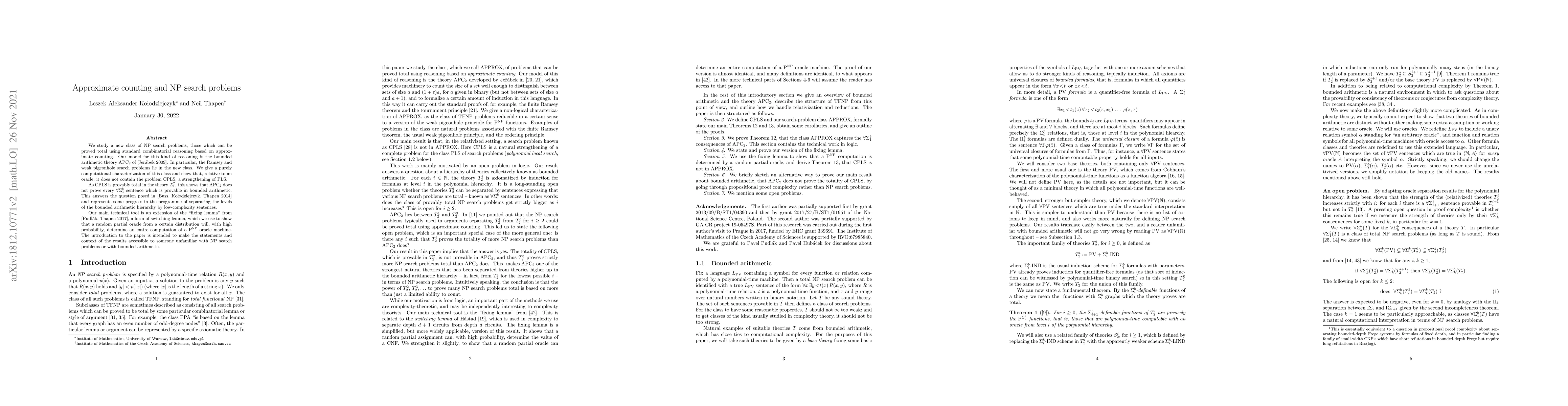 We study a new class of NP search problems, those which can be proved total using standard combinatorial reasoning based on approximate counting. Our model for this kind of reasoning is the bounded arithmetic theory $\mathrm{APC}_2$ of [Je\v{r}\'abek 2009]. In particular, the Ramsey and weak pigeonhole search problems lie in the new class. We give a purely computational characterization of this class and show that, relative to an oracle, it does not contain the problem CPLS, a strengthening of PLS. As CPLS is provably total in the theory $T^2_2$, this shows that $\mathrm{APC}_2$ does not prove every $\forall \Sigma^b_1$ sentence which is provable in bounded arithmetic. This answers the question posed in [Buss, Ko{\l}odziejczyk, Thapen 2014] and represents some progress in the programme of separating the levels of the bounded arithmetic hierarchy by low-complexity sentences. Our main technical tool is an extension of the "fixing lemma" from [Pudl\'ak, Thapen 2017], a form of switching lemma, which we use to show that a random partial oracle from a certain distribution will, with high probability, determine an entire computation of a $\textrm{P}^{\textrm{NP}}$ oracle machine. The introduction to the paper is intended to make the statements and context of the results accessible to someone unfamiliar with NP search problems or with bounded arithmetic.