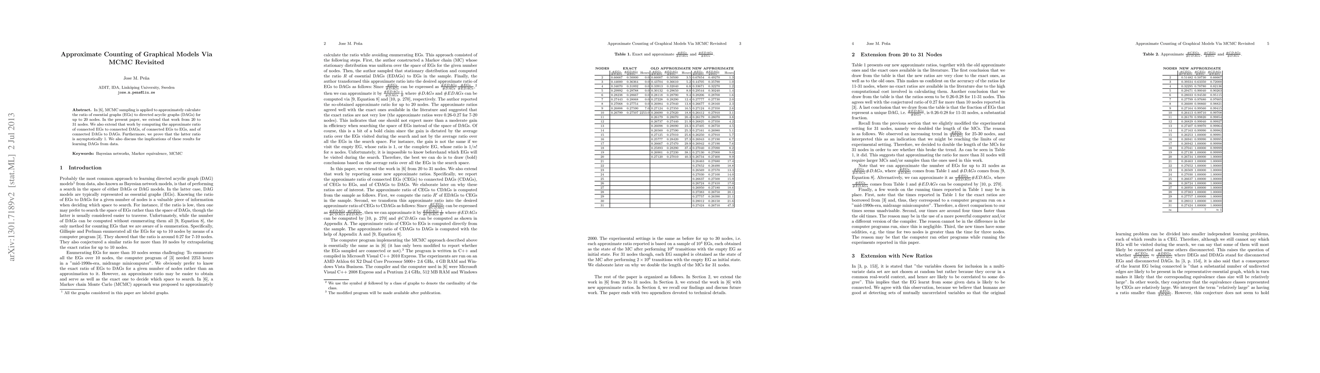 In Pe\~na (2007), MCMC sampling is applied to approximately calculate the ratio of essential graphs (EGs) to directed acyclic graphs (DAGs) for up to 20 nodes. In the present paper, we extend that work from 20 to 31 nodes. We also extend that work by computing the approximate ratio of connected EGs to connected DAGs, of connected EGs to EGs, and of connected DAGs to DAGs. Furthermore, we prove that the latter ratio is asymptotically 1. We also discuss the implications of these results for learning DAGs from data.