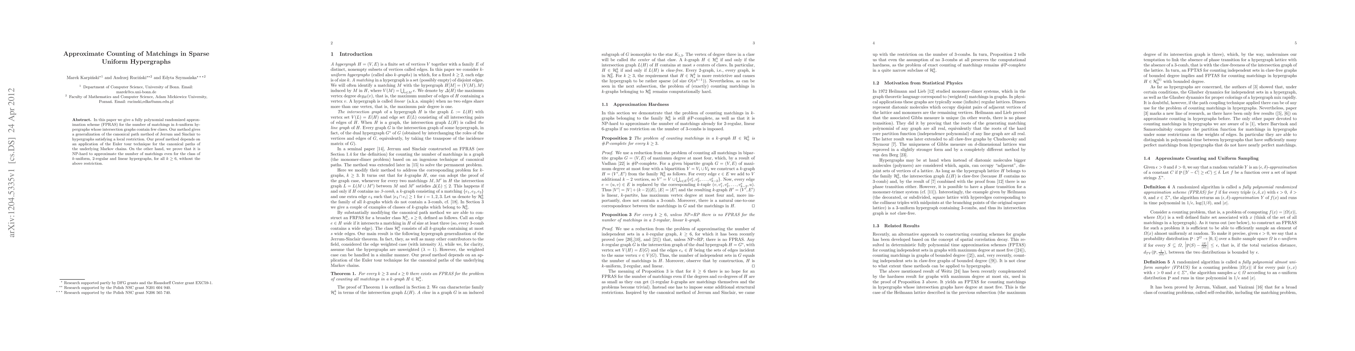 This paper presents a fully polynomial randomized approximation scheme (FPRAS) for counting matchings in sparse k-uniform hypergraphs with few claw intersections, extending the canonical path method. It also demonstrates the NP-hardness of approximating matchings in k-uniform, 2-regular, and linear hypergraphs for k >= 6 without the specified restriction.