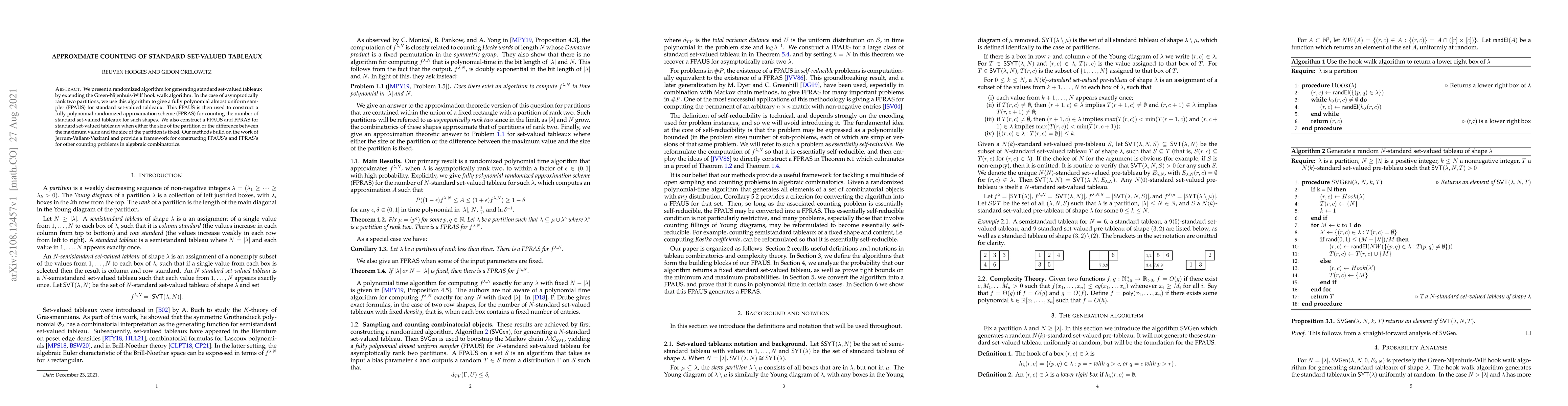 This paper introduces a randomized algorithm for generating standard set-valued tableaux, extending the Green-Nijenhuis-Wilf hook walk method. It provides a fully polynomial almost uniform sampler (FPAUS) and a fully polynomial randomized approximation scheme (FPRAS) for counting these tableaux, particularly for asymptotically rank two partitions.