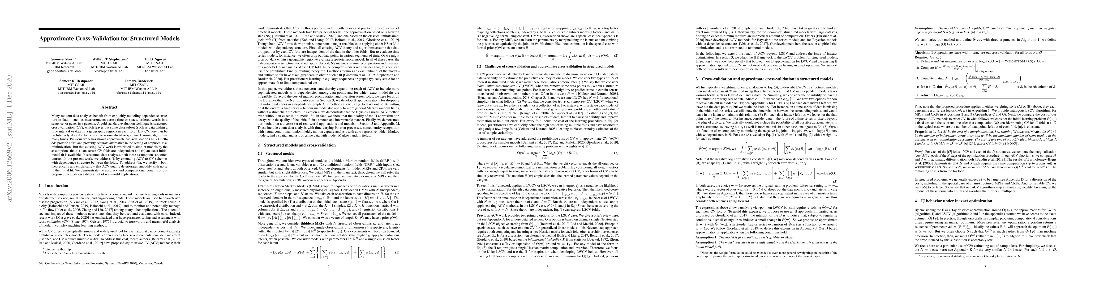 This paper proposes an approximate cross-validation method for structured models that overcomes limitations of existing techniques by accounting for dependencies between folds and the impact of noisy initial model fits. The authors demonstrate the effectiveness of their approach through theoretical analysis and practical applications.