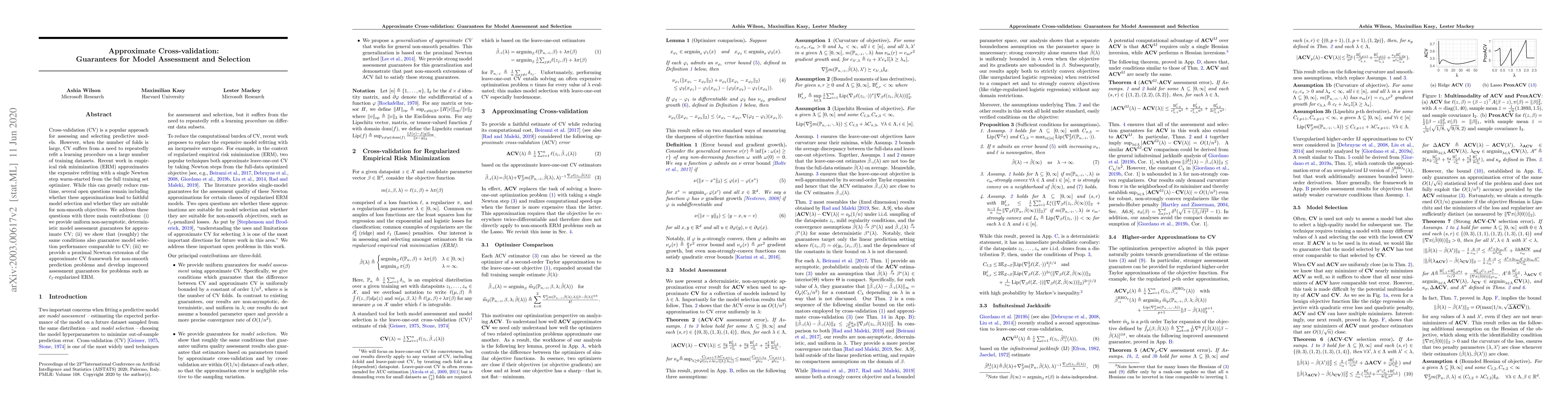 Cross-validation (CV) is a popular approach for assessing and selecting predictive models. However, when the number of folds is large, CV suffers from a need to repeatedly refit a learning procedure on a large number of training datasets. Recent work in empirical risk minimization (ERM) approximates the expensive refitting with a single Newton step warm-started from the full training set optimizer. While this can greatly reduce runtime, several open questions remain including whether these approximations lead to faithful model selection and whether they are suitable for non-smooth objectives. We address these questions with three main contributions: (i) we provide uniform non-asymptotic, deterministic model assessment guarantees for approximate CV; (ii) we show that (roughly) the same conditions also guarantee model selection performance comparable to CV; (iii) we provide a proximal Newton extension of the approximate CV framework for non-smooth prediction problems and develop improved assessment guarantees for problems such as l1-regularized ERM.