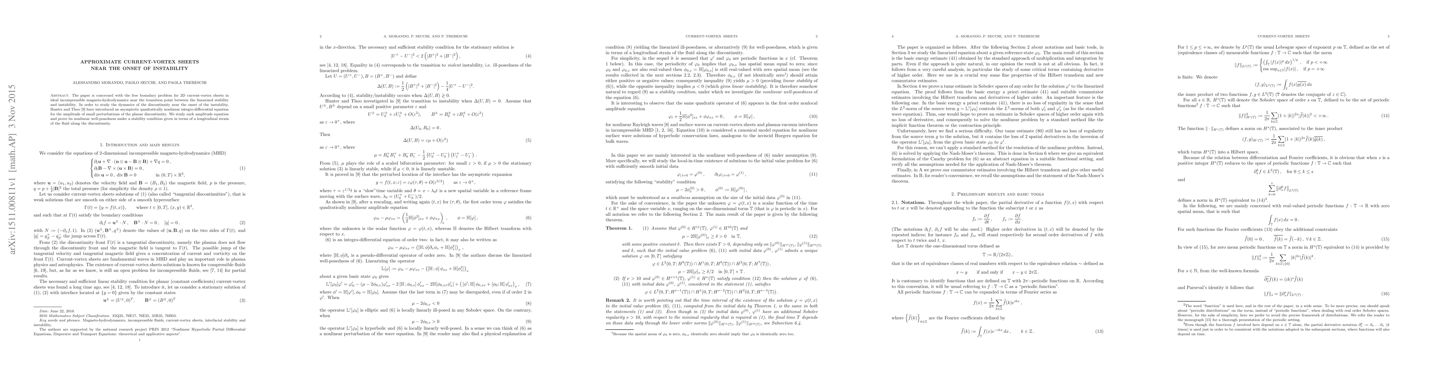 This paper investigates the dynamics of 2D current-vortex sheets in ideal incompressible magneto-hydrodynamics near the onset of instability, introducing an asymptotic quadratically nonlinear integro-differential equation to study small perturbations. The authors prove the nonlinear well-posedness of this equation under a stability condition related to the longitudinal strain of the fluid.
