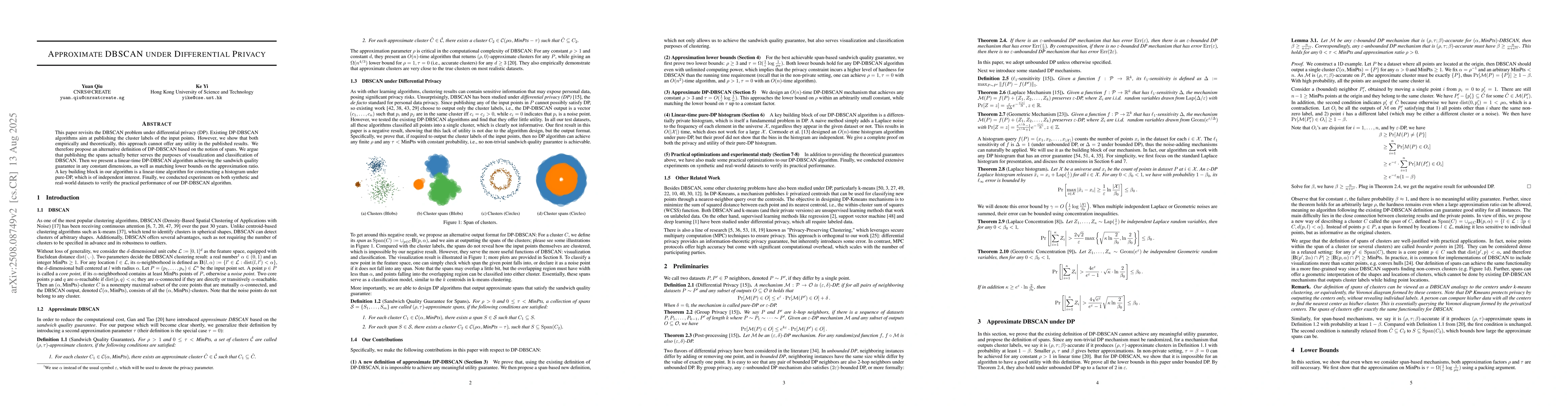 This paper revisits the DBSCAN problem under differential privacy (DP). Existing DP-DBSCAN algorithms aim at publishing the cluster labels of the input points. However, we show that both empirically and theoretically, this approach cannot offer any utility in the published results. We therefore propose an alternative definition of DP-DBSCAN based on the notion of spans. We argue that publishing the spans actually better serves the purposes of visualization and classification of DBSCAN. Then we present a linear-time DP-DBSCAN algorithm achieving the sandwich quality guarantee in any constant dimensions, as well as matching lower bounds on the approximation ratio. A key building block in our algorithm is a linear-time algorithm for constructing a histogram under pure-DP, which is of independent interest. Finally, we conducted experiments on both synthetic and real-world datasets to verify the practical performance of our DP-DBSCAN algorithm.