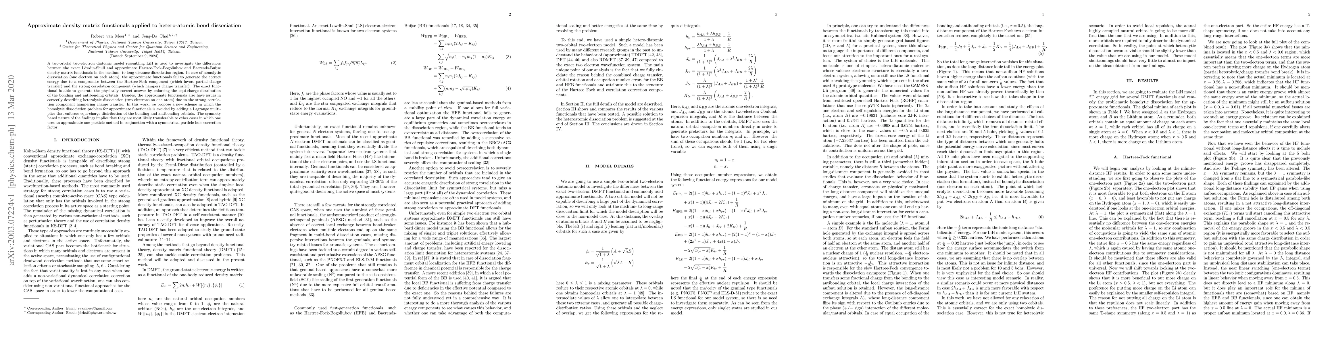 A two-orbital two-electron diatomic model resembling LiH is used to investigate the differences between the exact L\"owdin-Shull and approximate Hartree-Fock-Bogoliubov and Baerends-Buijse density matrix functionals in the medium- to long-distance dissociation region. In case of homolytic dissociation (one electron on each atom), the approximate functionals fail to generate the correct energy due to a compromise between the Hartree-Fock component (which favors partial charge transfer) and the strong correlation component (which hampers charge transfer). The exact functional is able to generate the physically correct answer by enforcing the equi-charge distribution of the bonding and antibonding orbitals. Besides, the approximate functionals also have issues in correctly describing heterolytic dissociation (two electrons on one atom) due to the strong correlation component hampering charge transfer. In this work, we propose a new scheme in which the homolytic dissociation problem for approximate functionals is avoided by adding a Lagrange multiplier that enforces equi-charge distribution of the bonding and antibonding orbitals. The symmety based nature of the findings implies that they are most likely transferable to other cases in which one uses an approximate one-particle method in conjunction with a symmetrical particle-hole correction factor.