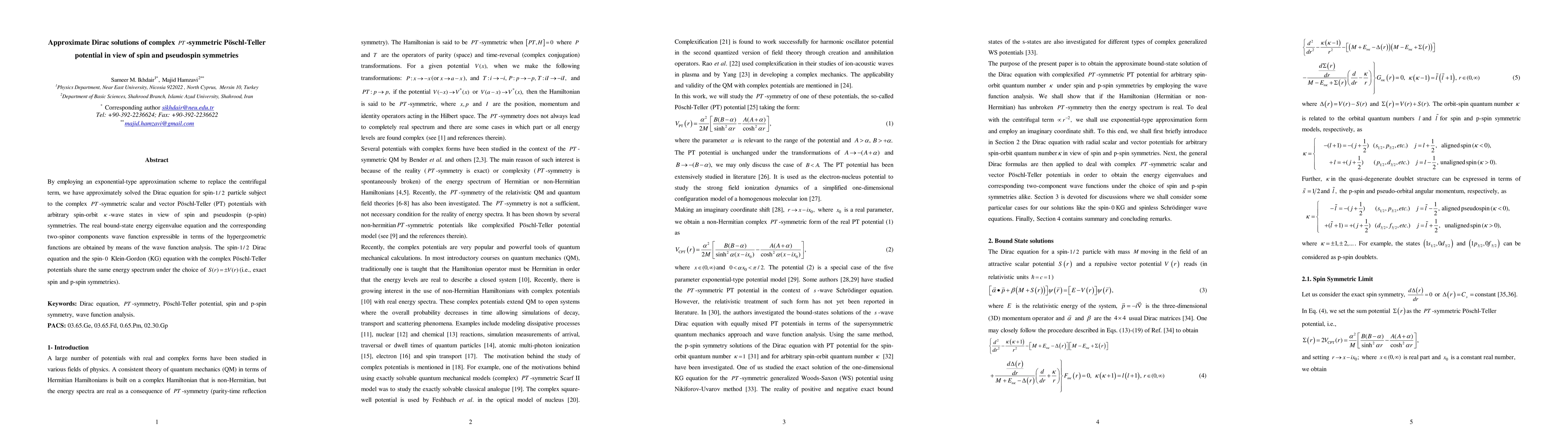 By employing an exponential-type approximation scheme to replace the centrifugal term, we have approximately solved the Dirac equation for spin- particle subject to the complex -symmetric scalar and vector P\"oschl-Teller (PT) potentials with arbitrary spin-orbit -wave states in view of spin and pseudospin (p-spin) symmetries. The real bound-state energy eigenvalue equation and the corresponding two-spinor components wave function expressible in terms of the hypergeometric functions are obtained by means of the wave function analysis. The spin- Dirac equation and the spin- Klein-Gordon (KG) equation with the complex P\"oschl-Teller potentials share the same energy spectrum under the choice of (i.e., exact spin and p-spin symmetries).