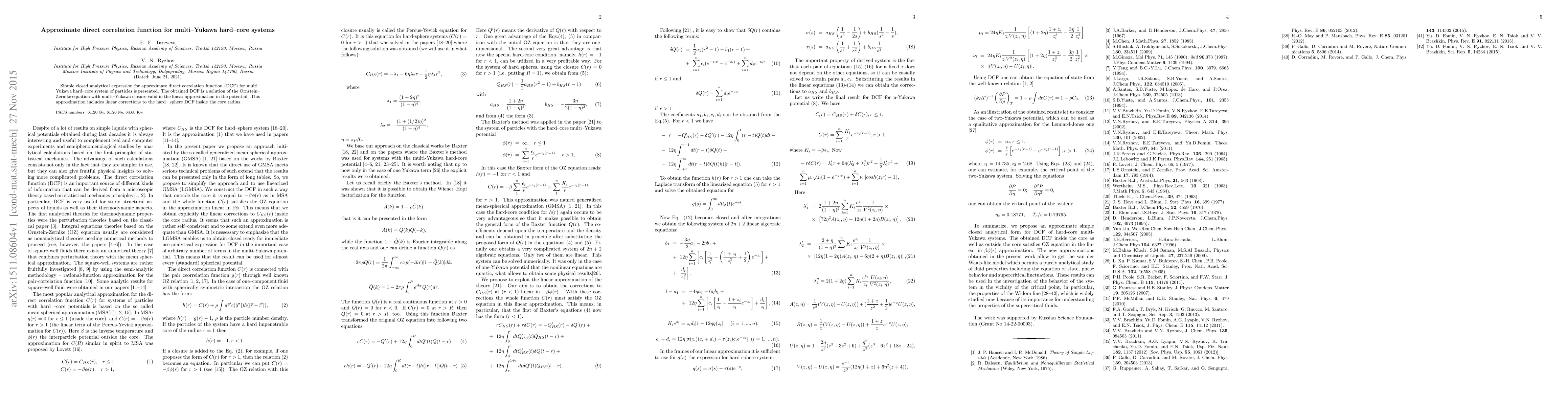 Simple closed analytical expression for approximate direct correlation function (DCF) for multi--Yukawa hard--core system of particles is presented. The obtained DCF is a solution of the Ornstein--Zernike equation with multi--Yukawa closure valid in the linear approximation in the potential. This approximation includes linear corrections to the hard-- sphere DCF inside the core radius.