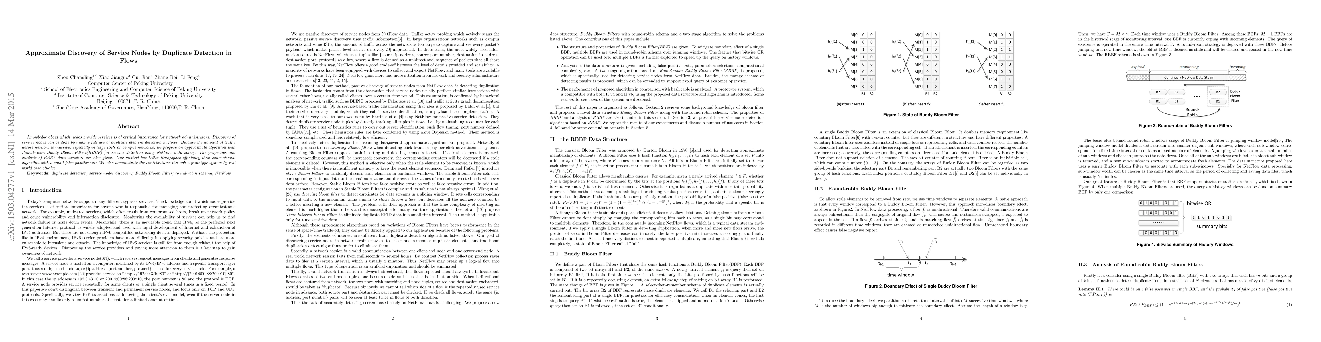 Knowledge about which nodes provide services is of critical importance for network administrators. Discovery of service nodes can be done by making full use of duplicate element detection in flows. Because the amount of traffic across network is massive, especially in large ISPs or campus networks, we propose an approximate algorithm with Round-robin Buddy Bloom Filters(RBBF) for service detection using NetFlow data solely. The properties and analysis of RBBF data structure are also given. Our method has better time/space efficiency than conventional algorithm with a small false positive rate.%portion of false positive. We also demonstrate the contributions through a prototype system by real world case studies.