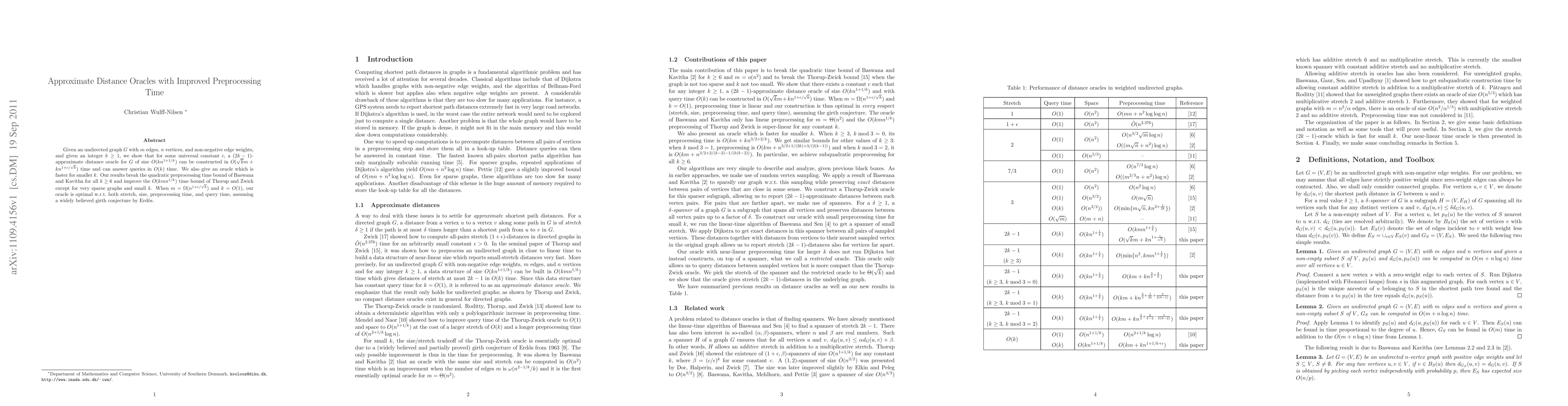 This paper presents an improved distance oracle for undirected graphs that achieves a $(2k-1)$-approximation with reduced preprocessing time, breaking the quadratic time bound for $k \geq 6$. The oracle has optimal size, preprocessing time, and query time under certain conditions, surpassing previous results by Baswana and Kavitha and Thorup and Zwick.