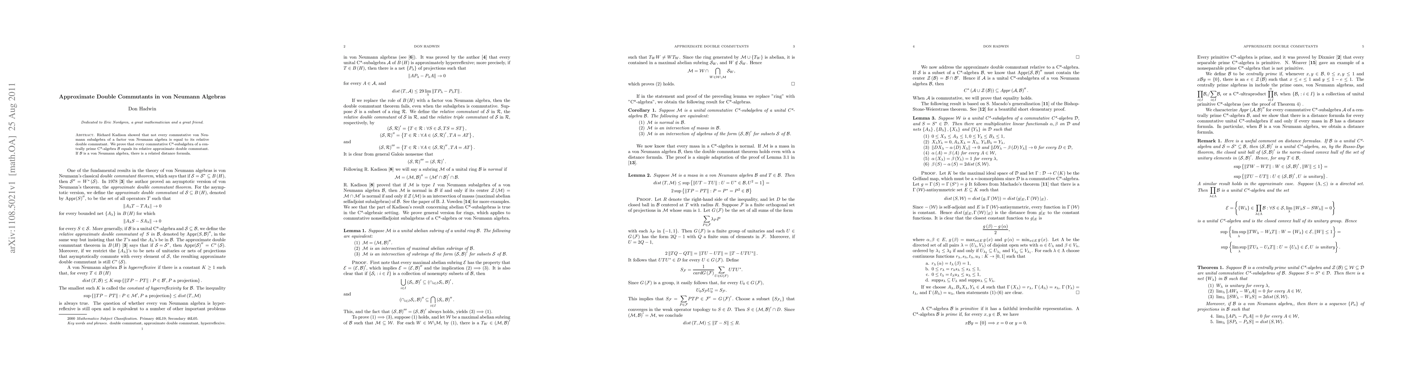 Summary: This paper proves that commutative C*-subalgebras in centrally prime C*-algebras equal their relative approximate double commutants, extending Richard Kadison's findings on von Neumann algebras. A distance formula is also provided when the algebra is specifically a von Neumann algebra.