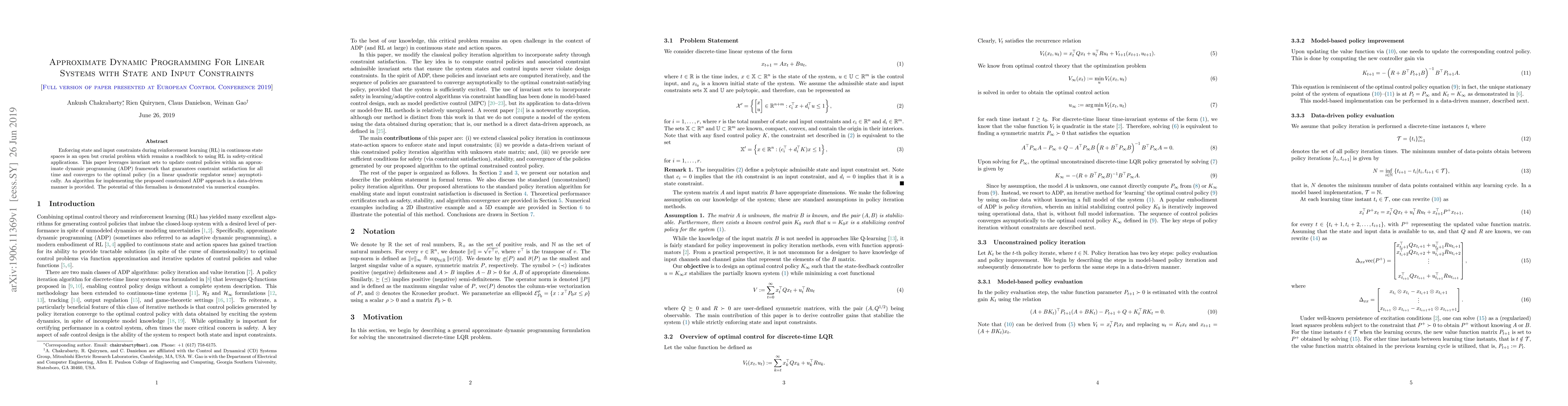 This paper proposes an approximate dynamic programming method for linear systems with state and input constraints, ensuring constraint satisfaction and convergence to the optimal policy. The approach uses invariant sets within a data-driven algorithm, validated through numerical examples.