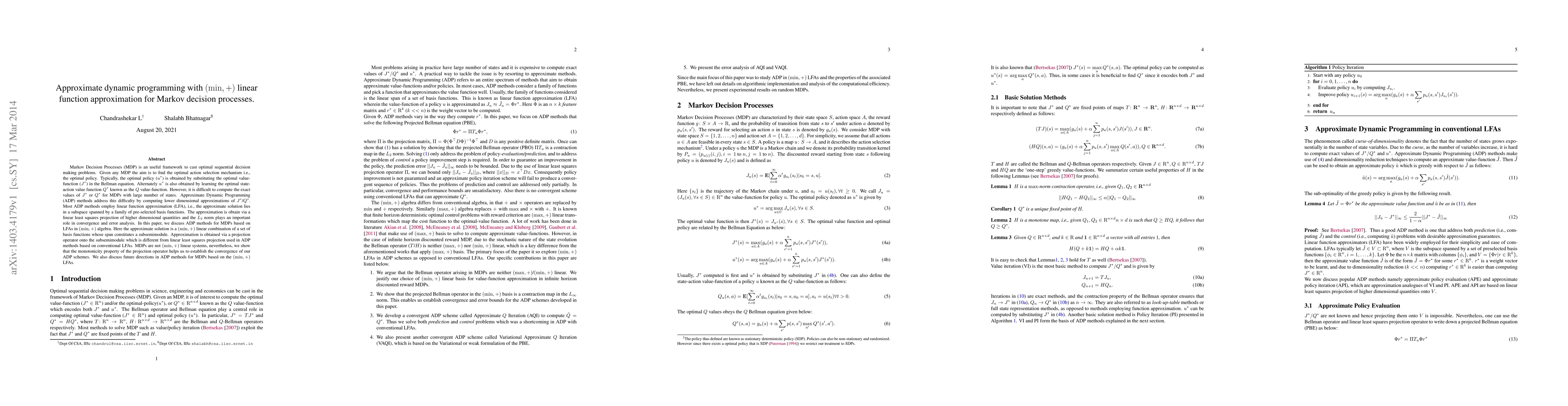 Markov Decision Processes (MDP) is an useful framework to cast optimal sequential decision making problems. Given any MDP the aim is to find the optimal action selection mechanism i.e., the optimal policy. Typically, the optimal policy ($u^*$) is obtained by substituting the optimal value-function ($J^*$) in the Bellman equation. Alternately $u^*$ is also obtained by learning the optimal state-action value function $Q^*$ known as the $Q$ value-function. However, it is difficult to compute the exact values of $J^*$ or $Q^*$ for MDPs with large number of states. Approximate Dynamic Programming (ADP) methods address this difficulty by computing lower dimensional approximations of $J^*$/$Q^*$. Most ADP methods employ linear function approximation (LFA), i.e., the approximate solution lies in a subspace spanned by a family of pre-selected basis functions. The approximation is obtain via a linear least squares projection of higher dimensional quantities and the $L_2$ norm plays an important role in convergence and error analysis. In this paper, we discuss ADP methods for MDPs based on LFAs in $(\min,+)$ algebra. Here the approximate solution is a $(\min,+)$ linear combination of a set of basis functions whose span constitutes a subsemimodule. Approximation is obtained via a projection operator onto the subsemimodule which is different from linear least squares projection used in ADP methods based on conventional LFAs. MDPs are not $(\min,+)$ linear systems, nevertheless, we show that the monotonicity property of the projection operator helps us to establish the convergence of our ADP schemes. We also discuss future directions in ADP methods for MDPs based on the $(\min,+)$ LFAs.
