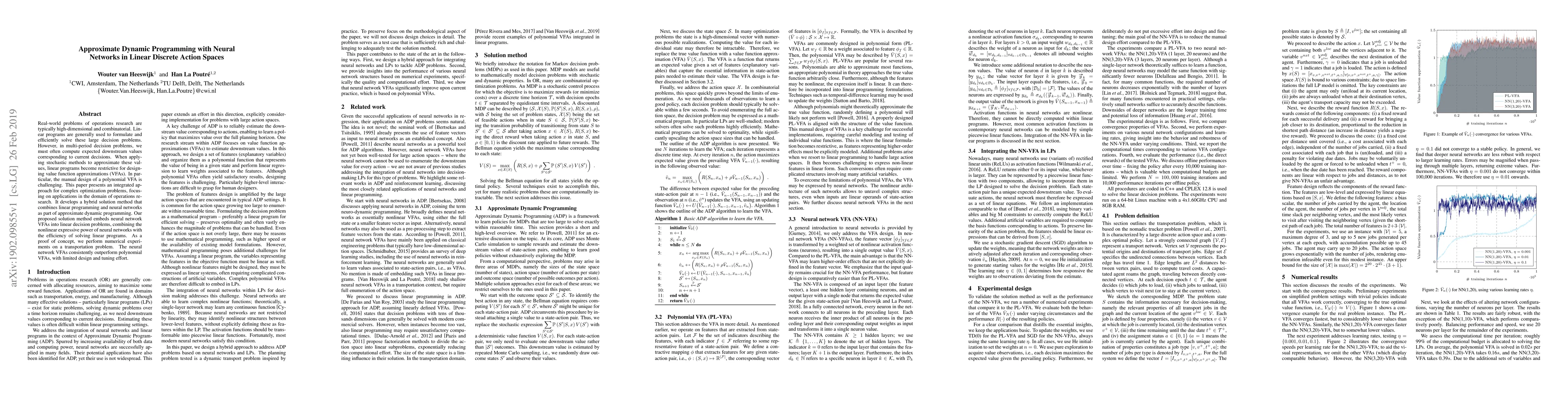 Real-world problems of operations research are typically high-dimensional and combinatorial. Linear programs are generally used to formulate and efficiently solve these large decision problems. However, in multi-period decision problems, we must often compute expected downstream values corresponding to current decisions. When applying stochastic methods to approximate these values, linear programs become restrictive for designing value function approximations (VFAs). In particular, the manual design of a polynomial VFA is challenging. This paper presents an integrated approach for complex optimization problems, focusing on applications in the domain of operations research. It develops a hybrid solution method that combines linear programming and neural networks as part of approximate dynamic programming. Our proposed solution method embeds neural network VFAs into linear decision problems, combining the nonlinear expressive power of neural networks with the efficiency of solving linear programs. As a proof of concept, we perform numerical experiments on a transportation problem. The neural network VFAs consistently outperform polynomial VFAs, with limited design and tuning effort.