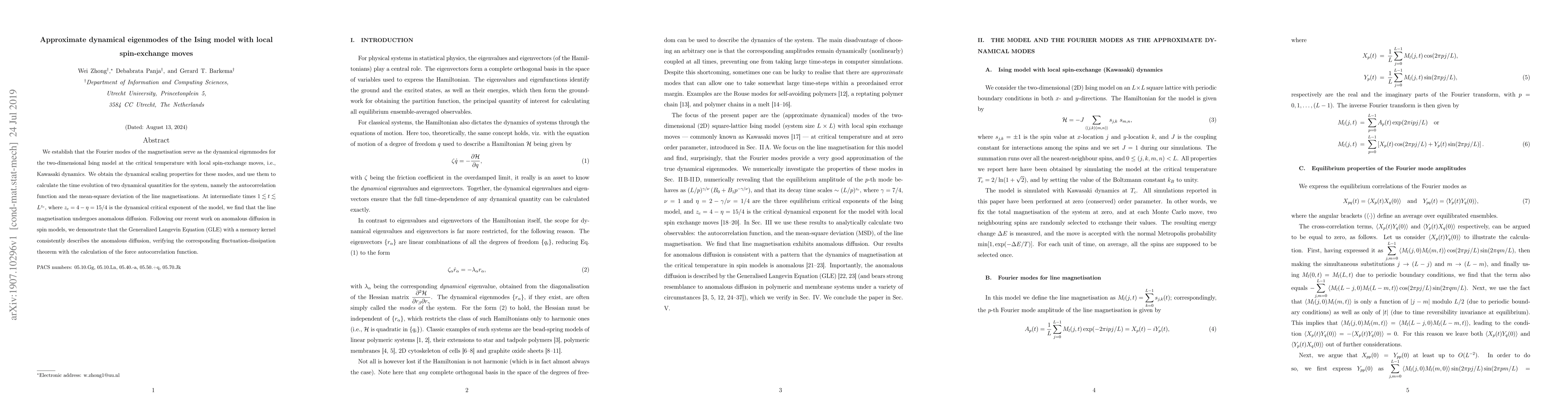 We establish that the Fourier modes of the magnetization serve as the dynamical eigenmodes for the two-dimensional Ising model at the critical temperature with local spin-exchange moves, i.e., Kawasaki dynamics. We obtain the dynamical scaling properties for these modes, and use them to calculate the time evolution of two dynamical quantities for the system, namely the autocorrelation function and the mean-square deviation of the line magnetizations. At intermediate times $1 \lesssim t \lesssim L^{z_c}$, where $z_c=4-\eta=15/4$ is the dynamical critical exponent of the model, we find that the line magnetization undergoes anomalous diffusion. Following our recent work on anomalous diffusion in spin models, we demonstrate that the Generalized Langevin Equation (GLE) with a memory kernel consistently describes the anomalous diffusion, verifying the corresponding fluctuation-dissipation theorem with the calculation of the force autocorrelation function.