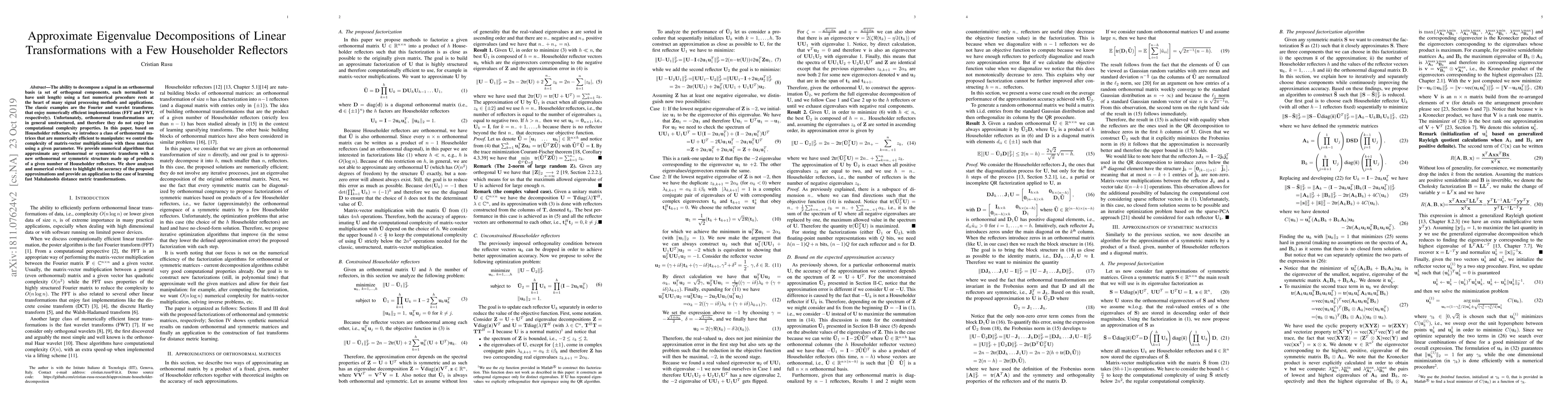 This paper introduces a method to approximate orthonormal transformations using a limited number of Householder reflectors, aiming to achieve both computational efficiency and accuracy in signal processing applications. The proposed approach provides numerical algorithms to construct orthonormal matrices with controlled complexity, demonstrating their effectiveness through analysis and application to learning fast Mahalanobis distance metrics.