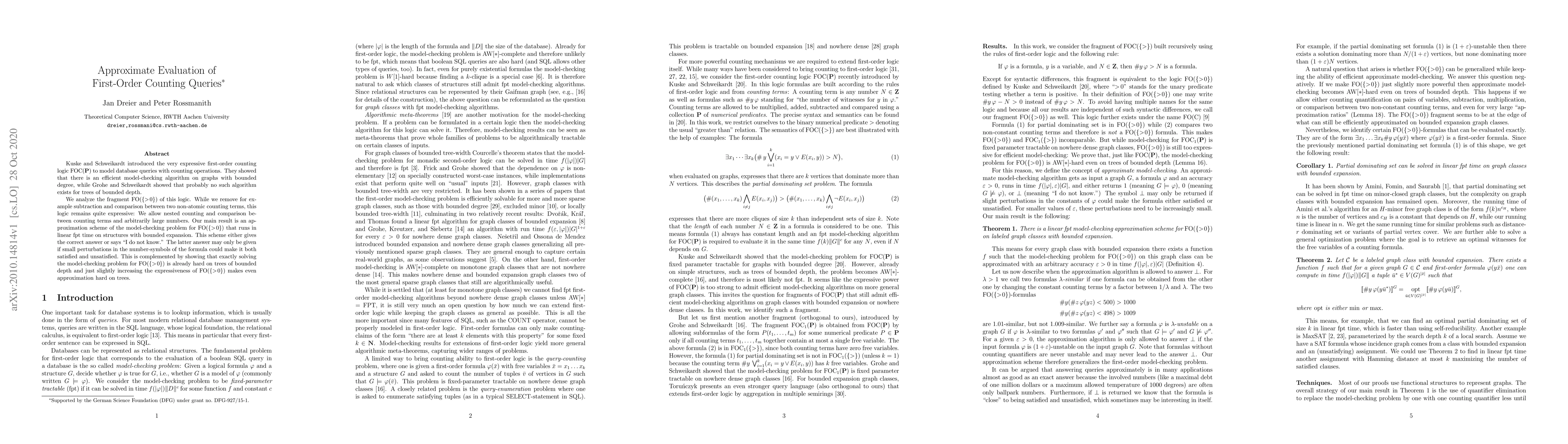 Kuske and Schweikardt introduced the very expressive first-order counting logic FOC(P) to model database queries with counting operations. They showed that there is an efficient model-checking algorithm on graphs with bounded degree, while Grohe and Schweikardt showed that probably no such algorithm exists for trees of bounded depth. We analyze the fragment FO({>0}) of this logic. While we remove for example subtraction and comparison between two non-atomic counting terms, this logic remains quite expressive: We allow nested counting and comparison between counting terms and arbitrarily large numbers. Our main result is an approximation scheme of the model-checking problem for FO({>0}) that runs in linear fpt time on structures with bounded expansion. This scheme either gives the correct answer or says "I do not know." The latter answer may only be given if small perturbations in the number-symbols of the formula could make it both satisfied and unsatisfied. This is complemented by showing that exactly solving the model-checking problem for FO({>0}) is already hard on trees of bounded depth and just slightly increasing the expressiveness of FO({>0}) makes even approximation hard on trees.