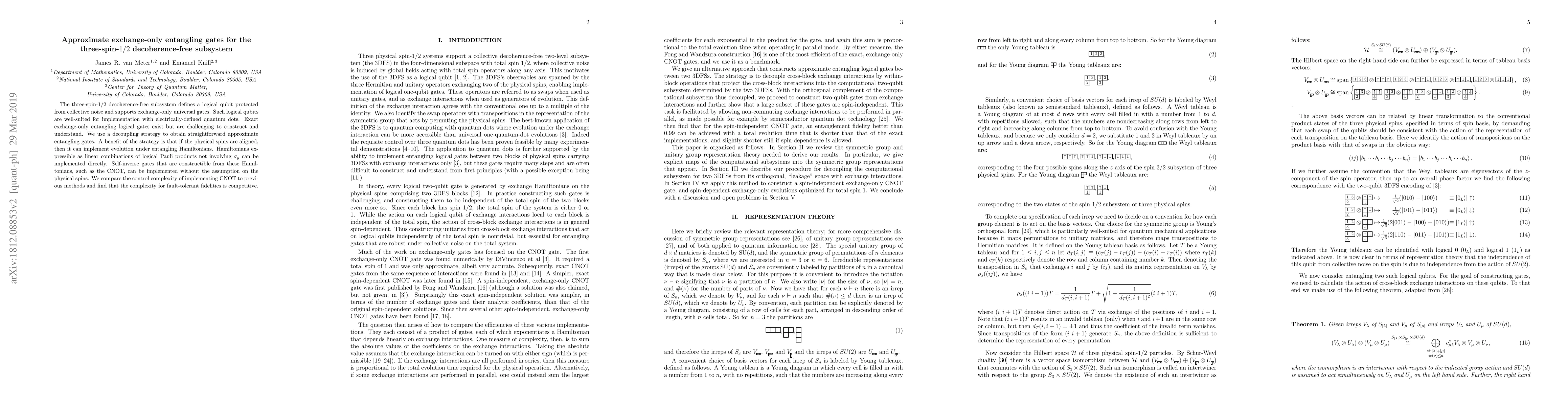 This paper proposes a decoupling strategy for creating approximate exchange-only entangling gates in a three-spin-$1/2$ decoherence-free subsystem, which simplifies gate construction and implementation. The method is particularly effective for self-inverse gates like the CNOT, showing competitive control complexity for fault-tolerant fidelities.