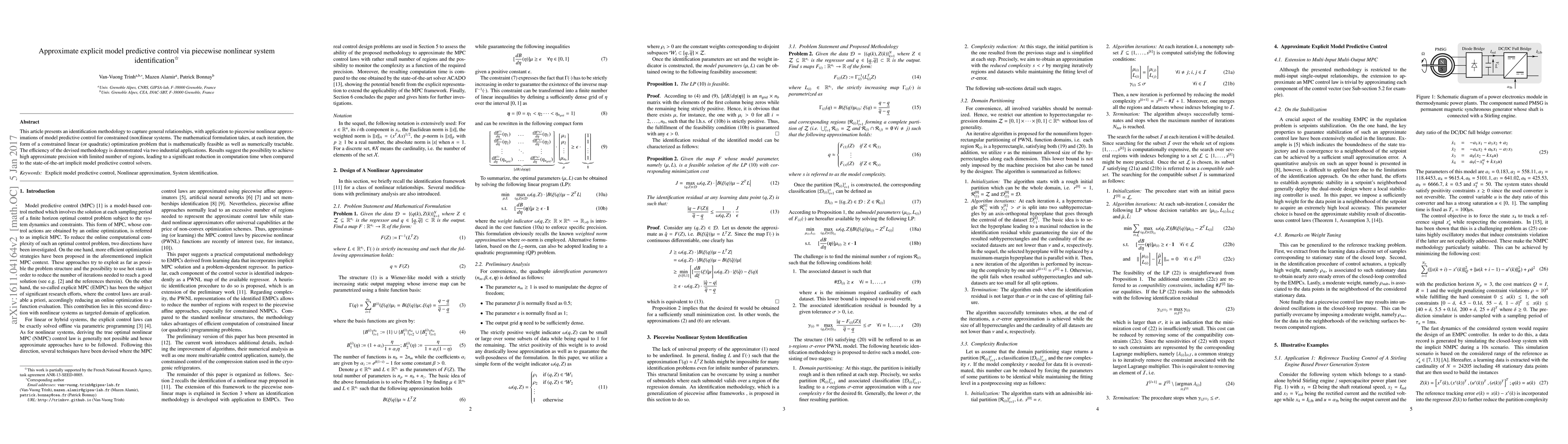 This article presents an identification methodology to capture general relationships, with application to piecewise nonlinear approximations of model predictive control for constrained (non)linear systems. The mathematical formulation takes, at each iteration, the form of a constrained linear (or quadratic) optimization problem that is mathematically feasible as well as numerically tractable. The efficiency of the devised methodology is demonstrated via two industrial applications. Results suggest the possibility to achieve high approximate precision with limited number of regions, leading to a significant reduction in computation time when compared to the state-of-the-art implicit model predictive control solvers.