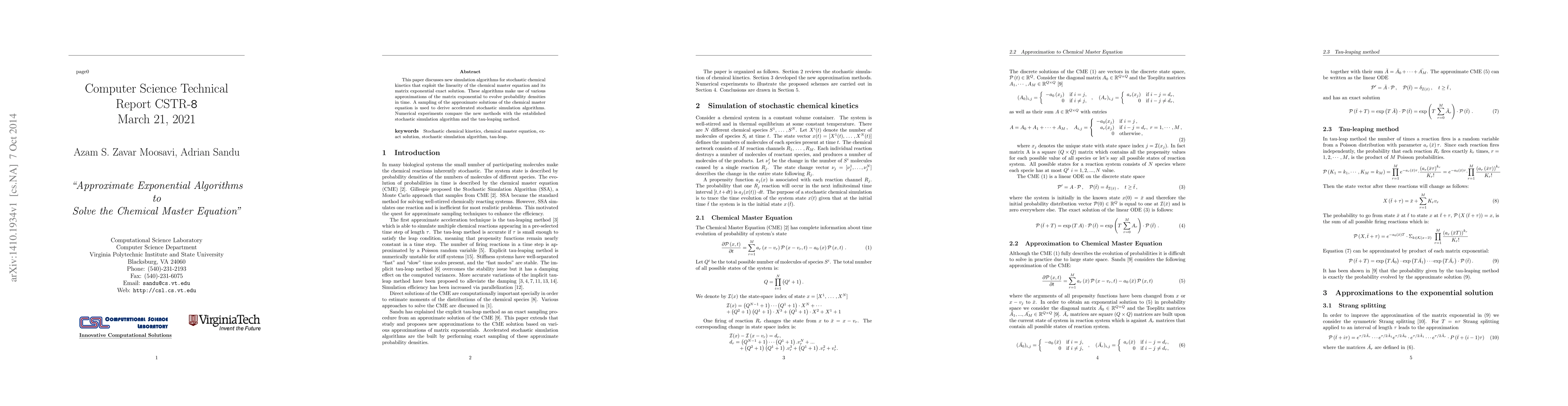 This paper introduces new simulation algorithms for stochastic chemical kinetics that approximate the matrix exponential of the chemical master equation to evolve probability densities over time. These methods are compared to established stochastic simulation and tau-leaping techniques through numerical experiments.