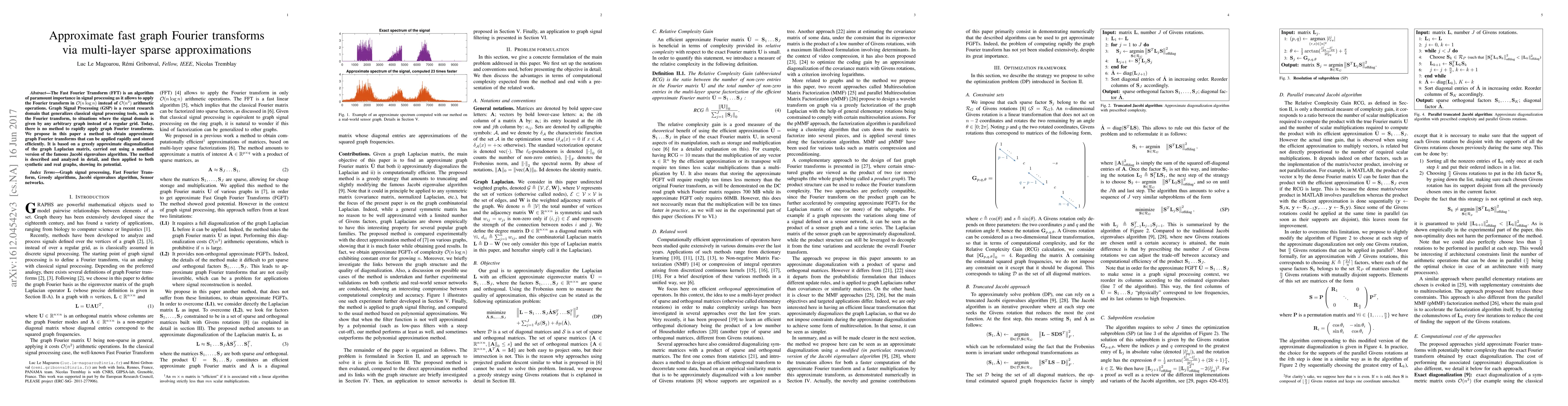 This paper proposes a method for rapidly computing approximate graph Fourier transforms using multi-layer sparse approximations. It leverages a modified Jacobi eigenvalues algorithm for efficient diagonalization of the graph Laplacian matrix, demonstrating effectiveness on both synthetic and real-world graphs.