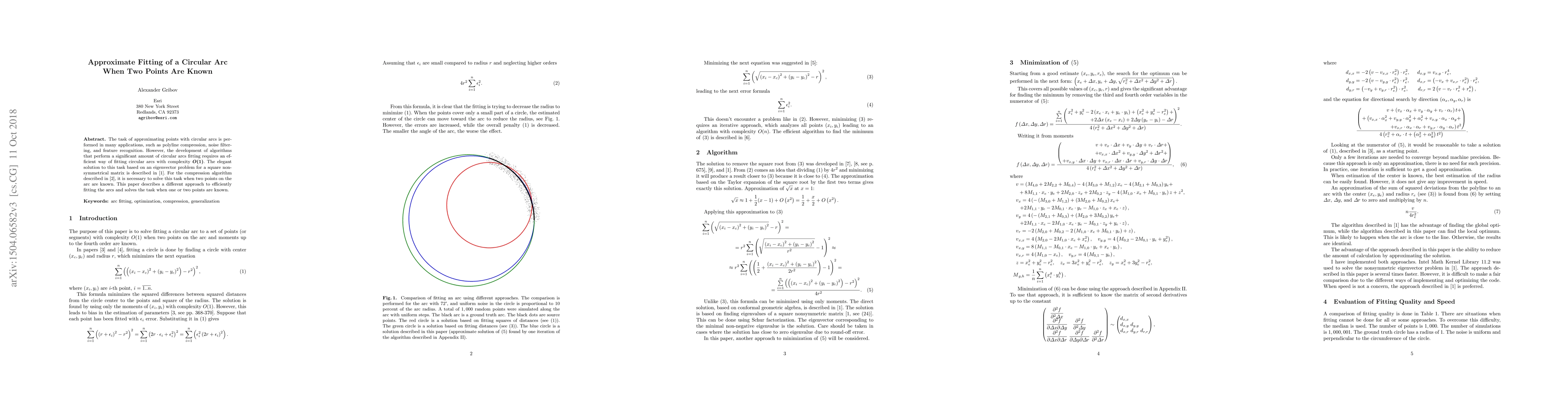 The task of approximating points with circular arcs is performed in many applications, such as polyline compression, noise filtering, and feature recognition. However, the development of algorithms that perform a significant amount of circular arcs fitting requires an efficient way of fitting circular arcs with complexity O(1). The elegant solution to this task based on an eigenvector problem for a square nonsymmetrical matrix is described in [1]. For the compression algorithm described in [2], it is necessary to solve this task when two points on the arc are known. This paper describes a different approach to efficiently fitting the arcs and solves the task when one or two points are known.