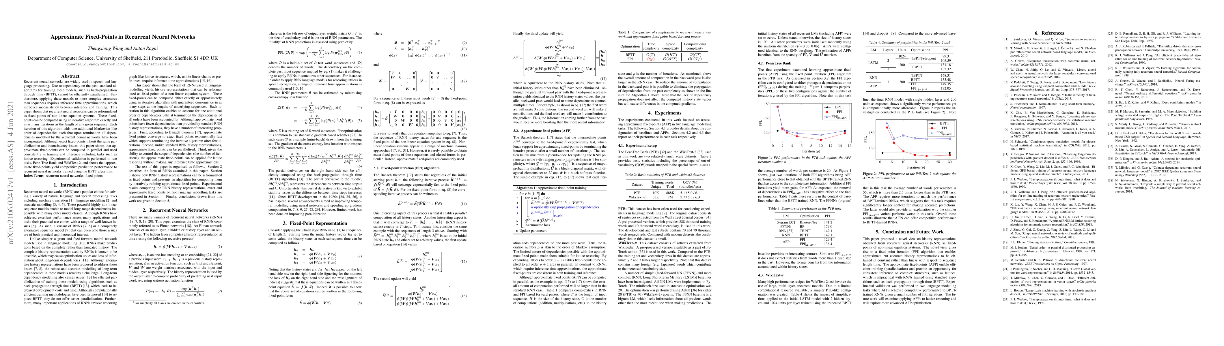 Recurrent neural networks are widely used in speech and language processing. Due to dependency on the past, standard algorithms for training these models, such as back-propagation through time (BPTT), cannot be efficiently parallelised. Furthermore, applying these models to more complex structures than sequences requires inference time approximations, which introduce inconsistency between inference and training. This paper shows that recurrent neural networks can be reformulated as fixed-points of non-linear equation systems. These fixed-points can be computed using an iterative algorithm exactly and in as many iterations as the length of any given sequence. Each iteration of this algorithm adds one additional Markovian-like order of dependencies such that upon termination all dependencies modelled by the recurrent neural networks have been incorporated. Although exact fixed-points inherit the same parallelization and inconsistency issues, this paper shows that approximate fixed-points can be computed in parallel and used consistently in training and inference including tasks such as lattice rescoring. Experimental validation is performed in two tasks, Penn Tree Bank and WikiText-2, and shows that approximate fixed-points yield competitive prediction performance to recurrent neural networks trained using the BPTT algorithm.
