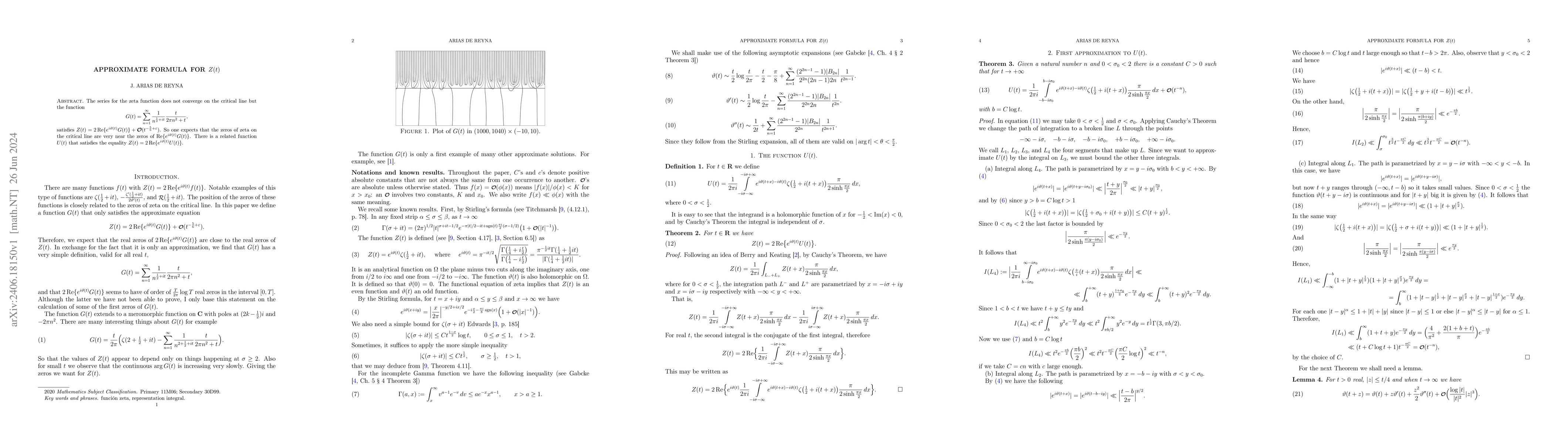 The series for the zeta function does not converge on the critical line but the function \[G(t)=\sum_{n=1}^\infty \frac{1}{n^{\frac12+it}}\frac{t}{2\pi n^2+t}\] satisfies $Z(t)=2\Re\{e^{i\vartheta(t)}G(t)\}+O(t^{-\frac56+\varepsilon})$. So one expects that the zeros of zeta on the critical line are very near the zeros of $\Re\{e^{i\vartheta(t)}G(t)\}$. There is a related function $U(t)$ that satisfies the equality $Z(t)=2\Re\{e^{i\vartheta(t)}U(t)\}$.