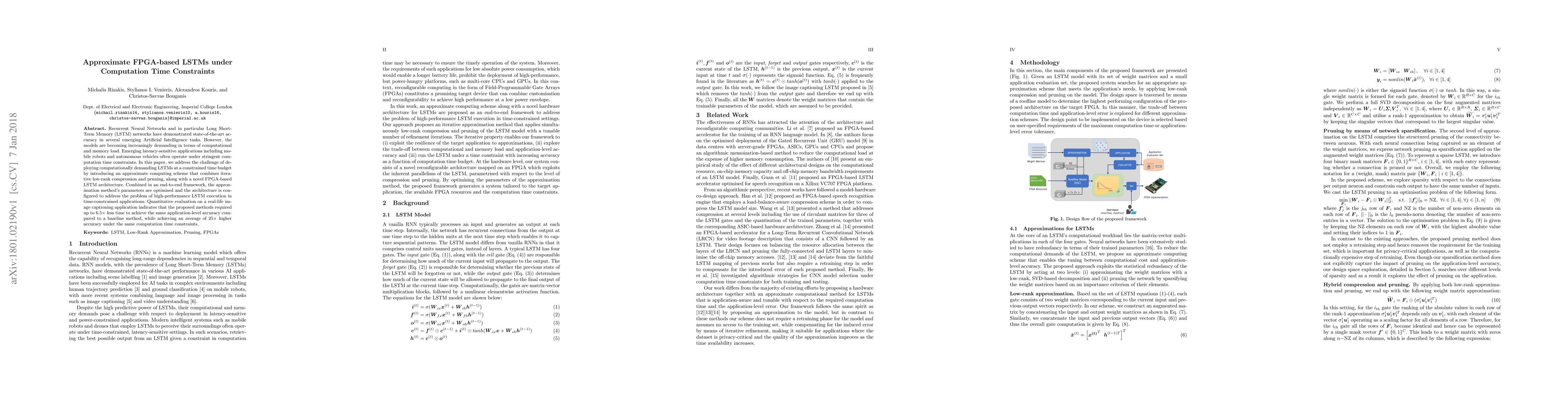 Recurrent Neural Networks and in particular Long Short-Term Memory (LSTM) networks have demonstrated state-of-the-art accuracy in several emerging Artificial Intelligence tasks. However, the models are becoming increasingly demanding in terms of computational and memory load. Emerging latency-sensitive applications including mobile robots and autonomous vehicles often operate under stringent computation time constraints. In this paper, we address the challenge of deploying computationally demanding LSTMs at a constrained time budget by introducing an approximate computing scheme that combines iterative low-rank compression and pruning, along with a novel FPGA-based LSTM architecture. Combined in an end-to-end framework, the approximation method's parameters are optimised and the architecture is configured to address the problem of high-performance LSTM execution in time-constrained applications. Quantitative evaluation on a real-life image captioning application indicates that the proposed methods required up to 6.5x less time to achieve the same application-level accuracy compared to a baseline method, while achieving an average of 25x higher accuracy under the same computation time constraints.