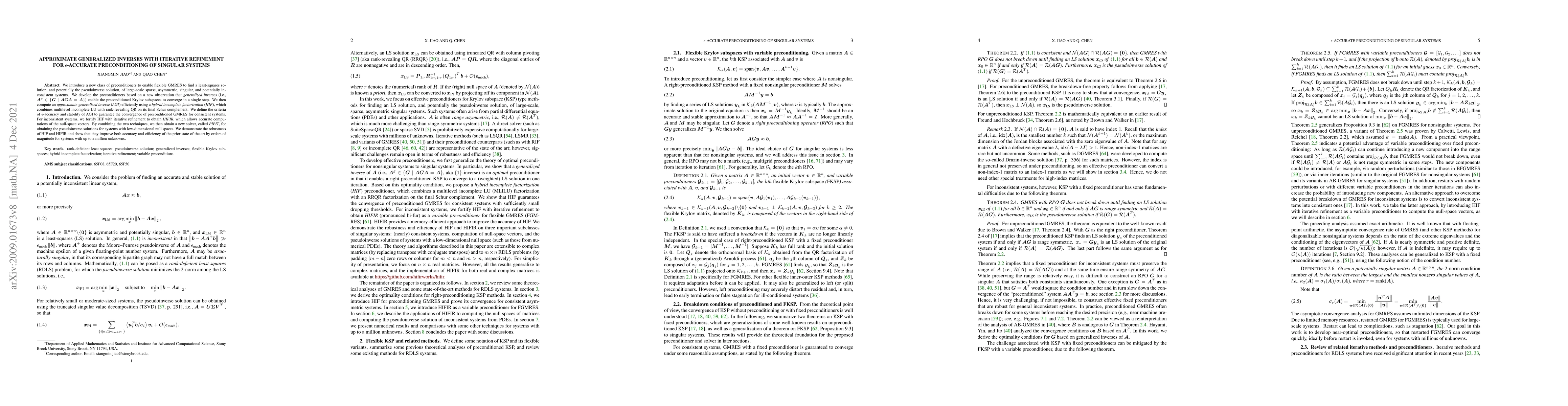 We introduce a new class of preconditioners to enable flexible GMRES to find a least-squares solution, and potentially the pseudoinverse solution, of large-scale sparse, asymmetric, singular, and potentially inconsistent systems. We develop the preconditioners based on a new observation that generalized inverses (i.e., $\boldsymbol{A}^{g}\in\{\boldsymbol{G}\mid\boldsymbol{A}\boldsymbol{G}\boldsymbol{A}=\boldsymbol{A}\}$) enable the preconditioned Krylov subspaces to converge in a single step. We then compute an approximate generalized inverse (AGI) efficiently using a hybrid incomplete factorization (HIF), which combines multilevel incomplete LU with rank-revealing QR on its final Schur complement. We define the criteria of $\epsilon$-accuracy and stability of AGI to guarantee the convergence of preconditioned GMRES for consistent systems. For inconsistent systems, we fortify HIF with iterative refinement to obtain HIFIR, which allows accurate computations of the null-space vectors. By combining the two techniques, we then obtain a new solver, called PIPIT, for obtaining the pseudoinverse solutions for systems with low-dimensional null spaces. We demonstrate the robustness of HIF and HIFIR and show that they improve both accuracy and efficiency of the prior state of the art by orders of magnitude for systems with up to a million unknowns.