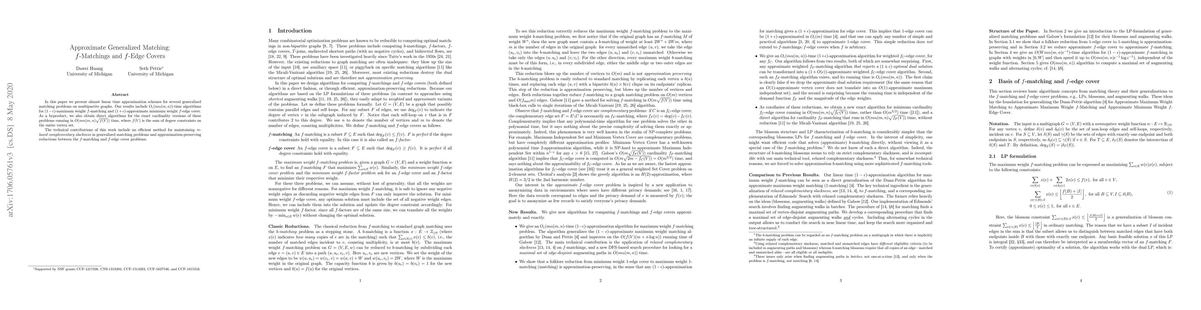 In this paper we present linear time approximation schemes for several generalized matching problems on nonbipartite graphs. Our results include $O_\epsilon(m)$-time algorithms for $(1-\epsilon)$-maximum weight $f$-factor and $(1+\epsilon)$-approximate minimum weight $f$-edge cover. As a byproduct, we also obtain direct algorithms for the exact cardinality versions of these problems running in $O(m\sqrt{f(V)})$ time. The technical contributions of this work include an efficient method for maintaining {\em relaxed complementary slackness} in generalized matching problems and approximation-preserving reductions between the $f$-factor and $f$-edge cover problems.