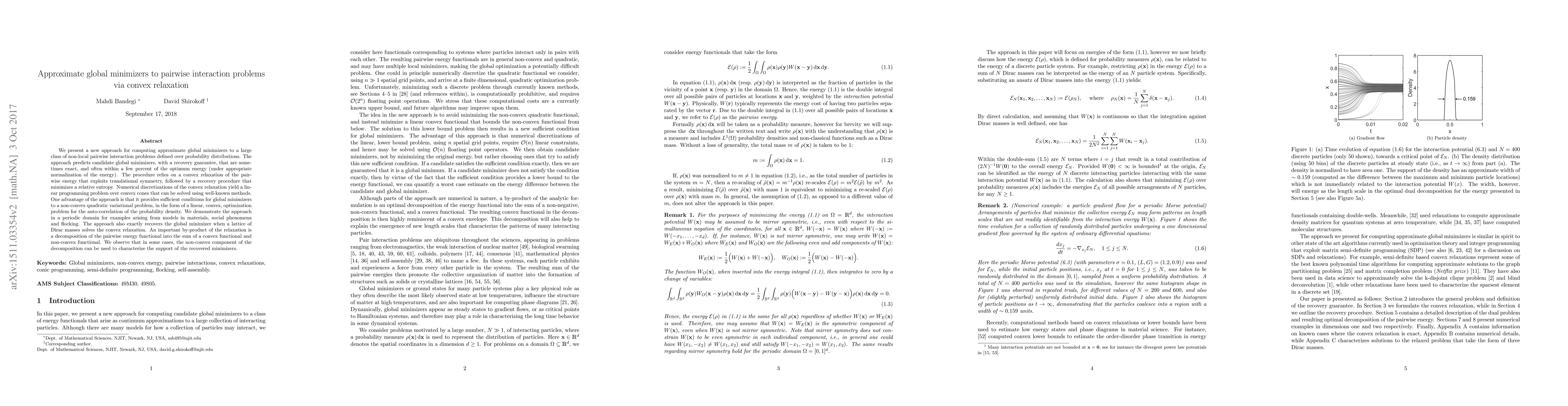 We present a new approach for computing approximate global minimizers to a large class of non-local pairwise interaction problems defined over probability distributions. The approach predicts candidate global minimizers, with a recovery guarantee, that are sometimes exact, and often within a few percent of the optimum energy (under appropriate normalization of the energy). The procedure relies on a convex relaxation of the pairwise energy that exploits translational symmetry, followed by a recovery procedure that minimizes a relative entropy. Numerical discretizations of the convex relaxation yield a linear programming problem over convex cones that can be solved using well-known methods. One advantage of the approach is that it provides sufficient conditions for global minimizers to a non-convex quadratic variational problem, in the form of a linear, convex, optimization problem for the auto-correlation of the probability density. We demonstrate the approach in a periodic domain for examples arising from models in materials, social phenomena and flocking. The approach also exactly recovers the global minimizer when a lattice of Dirac masses solves the convex relaxation. An important by-product of the relaxation is a decomposition of the pairwise energy functional into the sum of a convex functional and non-convex functional. We observe that in some cases, the non-convex component of the decomposition can be used to characterize the support of the recovered minimizers.