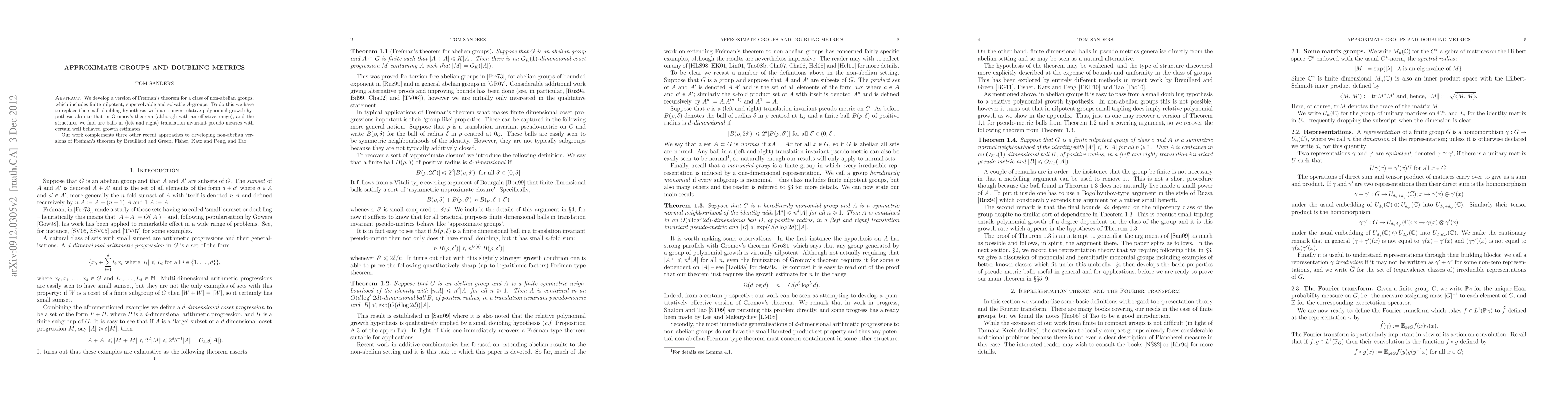 We develop a version of Freiman's theorem for a class of non-abelian groups, which includes finite nilpotent, supersolvable and solvable A-groups. To do this we have to replace the small doubling hypothesis with a stronger relative polynomial growth hypothesis akin to that in Gromov's theorem (although with an effective range), and the structures we find are balls in (left and right) translation invariant pseudo-metrics with certain well behaved growth estimates. Our work complements three other recent approaches to developing non-abelian versions of Freiman's theorem by Breuillard and Green, Fischer, Katz and Peng, and Tao.