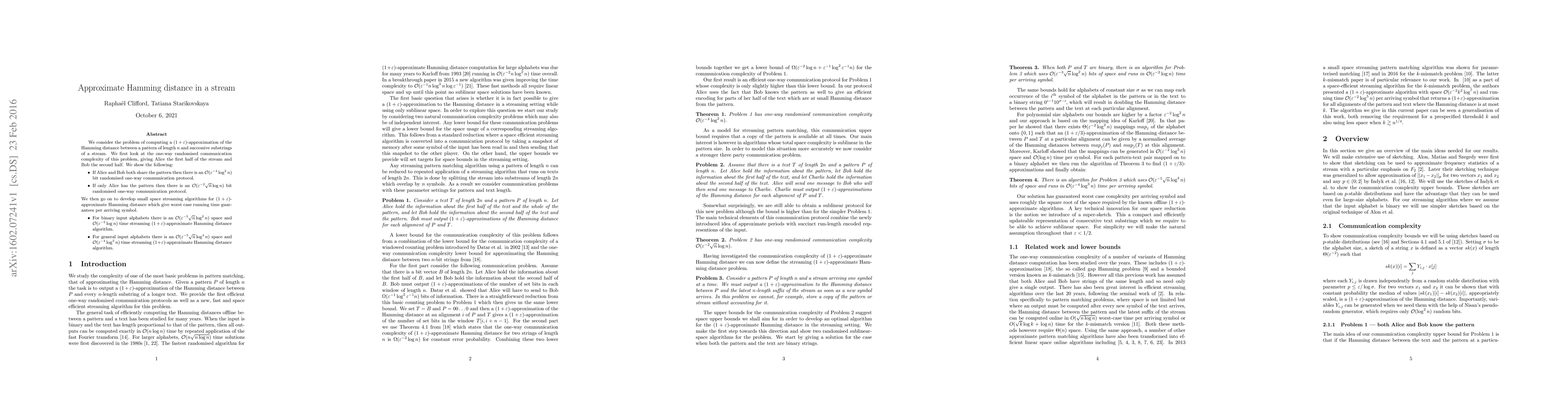 This paper addresses the problem of approximating Hamming distance between a fixed pattern and successive substrings in a data stream, presenting both communication complexity and streaming algorithms. It develops efficient protocols for both shared and private pattern scenarios, and provides space and time complexity guarantees for streaming algorithms on binary and general input alphabets.