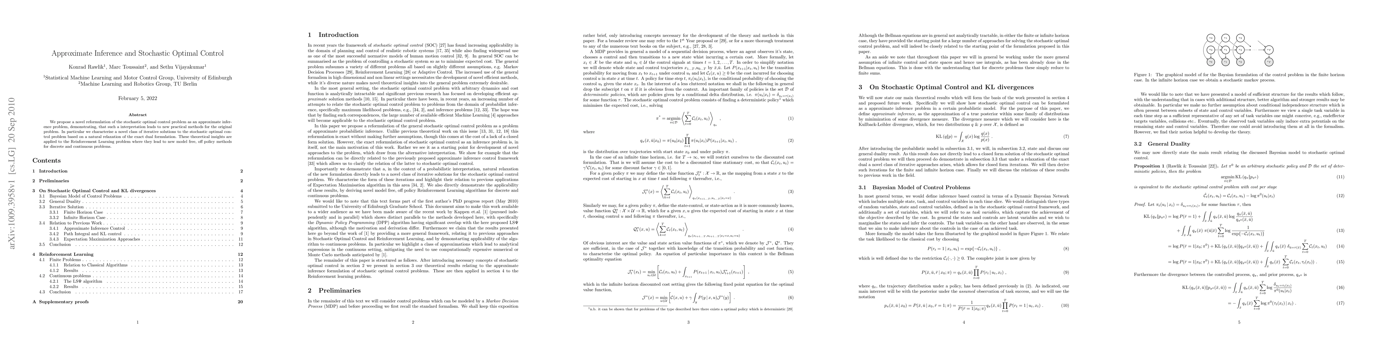 This paper reformulates the stochastic optimal control problem as an approximate inference issue, leading to new iterative solution methods. These insights enable novel model-free, off-policy reinforcement learning techniques for both discrete and continuous control problems.