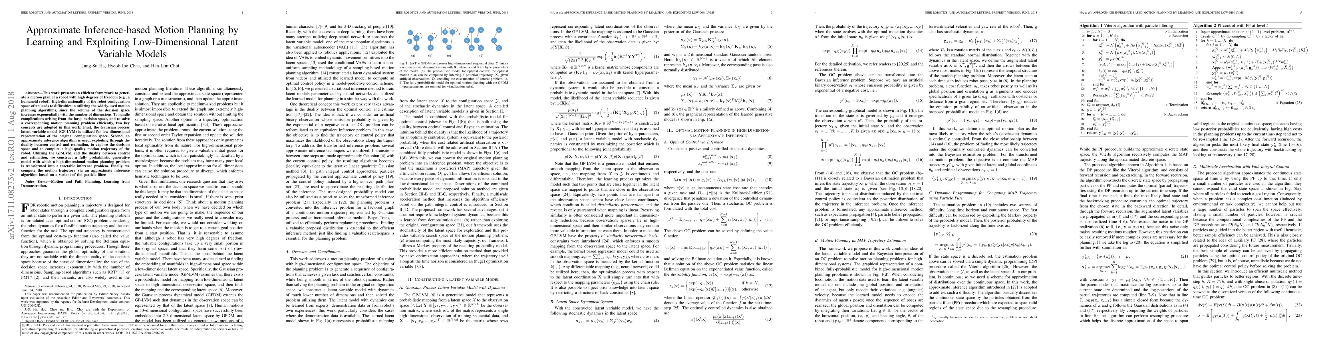 This paper proposes a framework for efficient motion planning of high-degree-of-freedom robots using a Gaussian process latent variable model for low-dimensional representation and an approximate inference algorithm to transform high-dimensional planning into a tractable problem. The approach leverages the duality between control and estimation to compute high-quality motion trajectories.